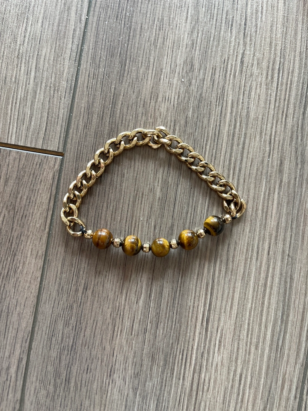 Selling a stylish gold-tone chain bracelet featuring tiger eye beads! This bracelet adds a touch of earthy elegance to any outfit. The tiger eye stones have a beautiful golden-brown shimmer, making it a unique accessory for your collection