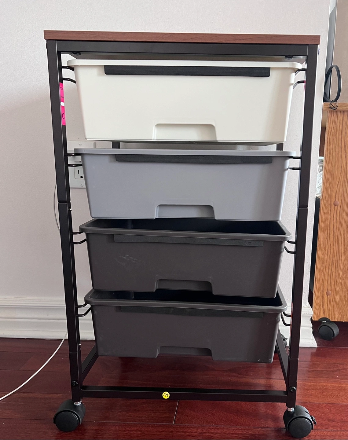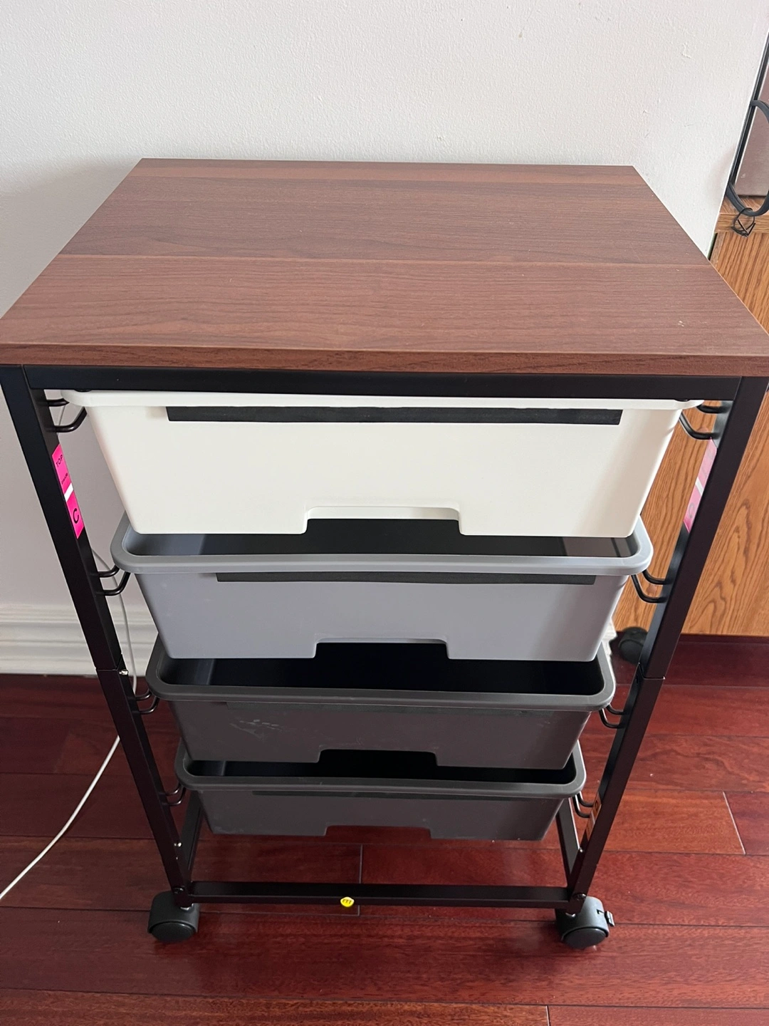 Here's a handy rolling storage cart with four drawers! It's perfect for organizing your space. The cart features a wooden top and multiple drawers in varying shades of grey and white. Great for a home office, craft room, or anywhere you need extra storage on wheels