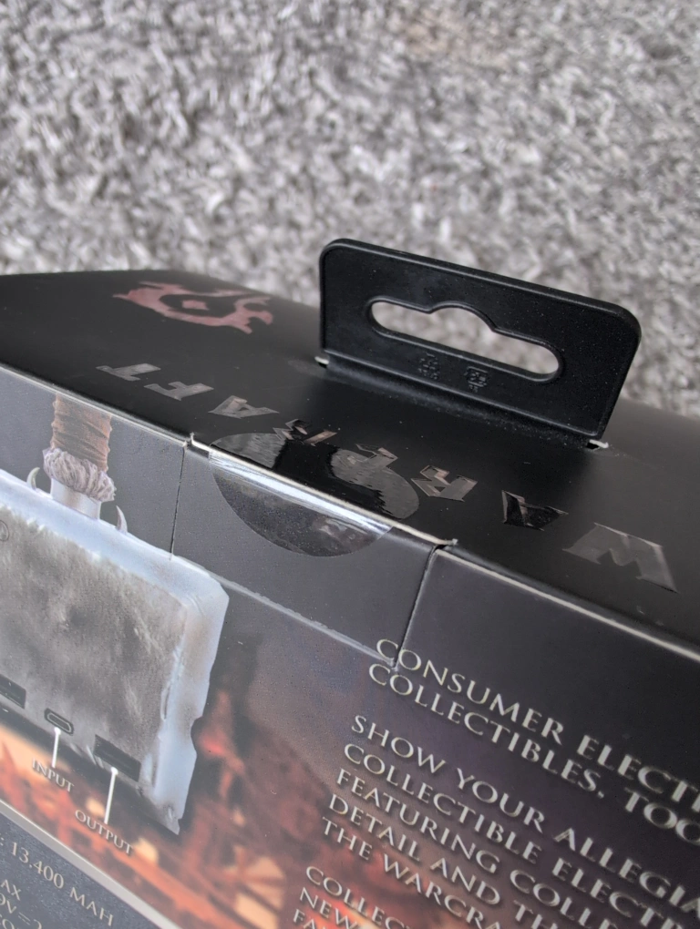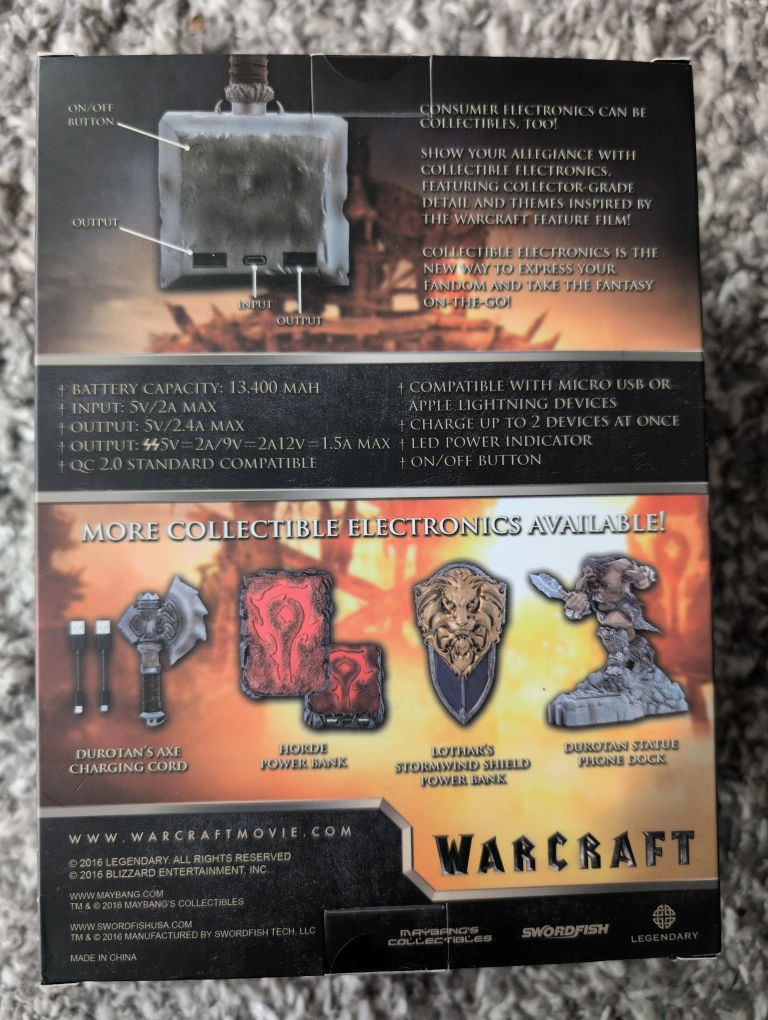 Selling a brand new Warcraft Doomhammer Power Bank! It has a battery capacity of 13,400mAh and is compatible with Micro USB or Apple Lightning devices. You can even charge up to 2 devices at once. It also has an LED power indicator and on/off button.