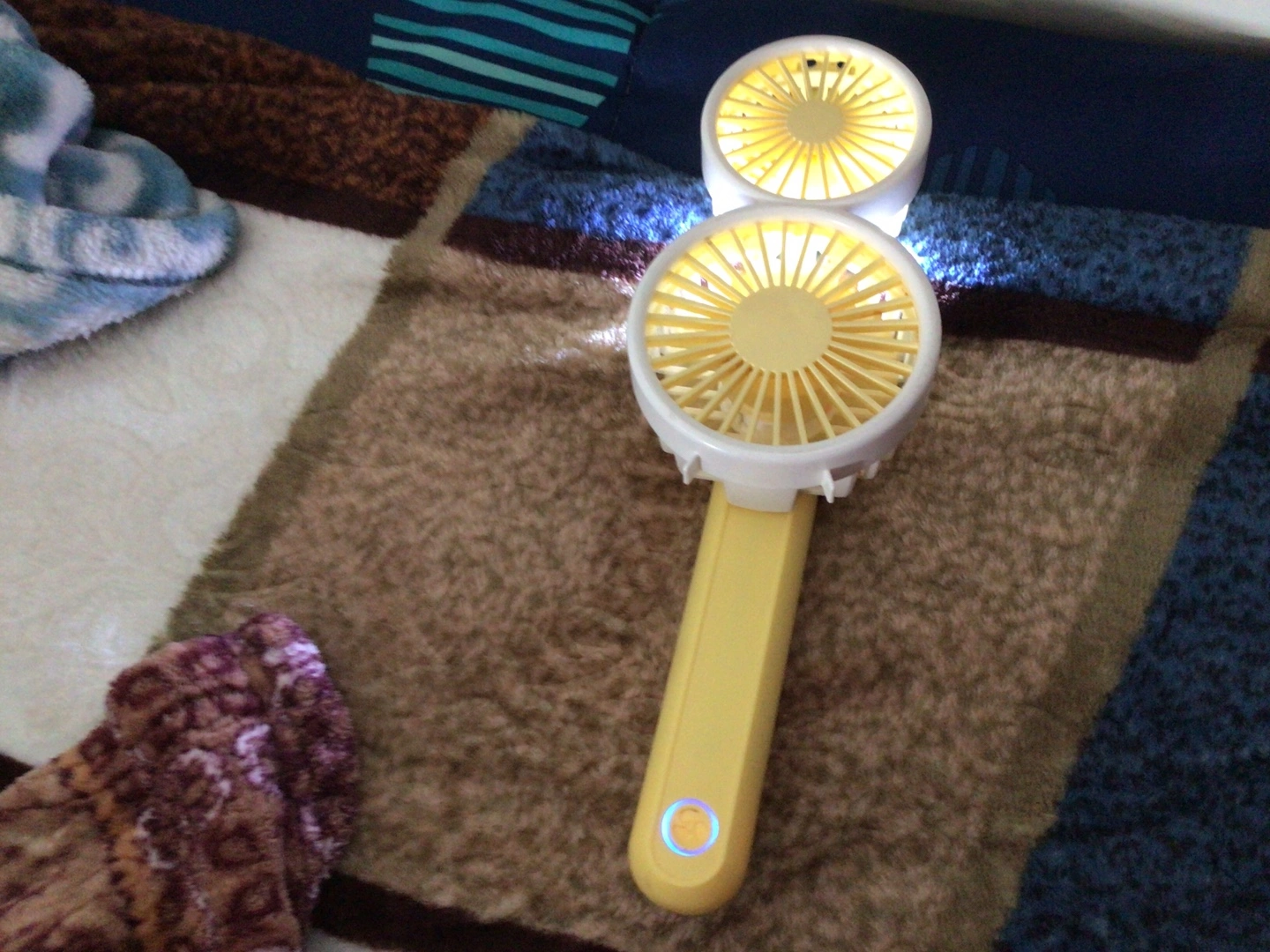 This is a cute yellow double head handheld fan! It's perfect for staying cool on the go. It's lightweight and portable, so you can easily take it with you wherever you need it