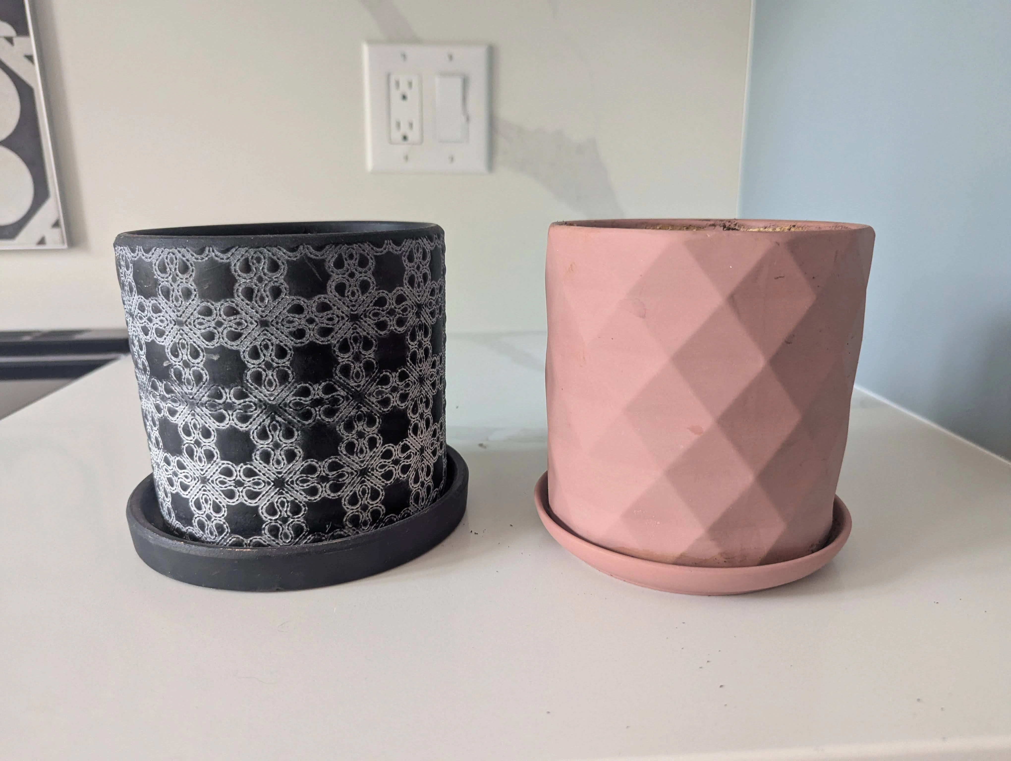 A black planter with a beautiful white lace-like pattern.