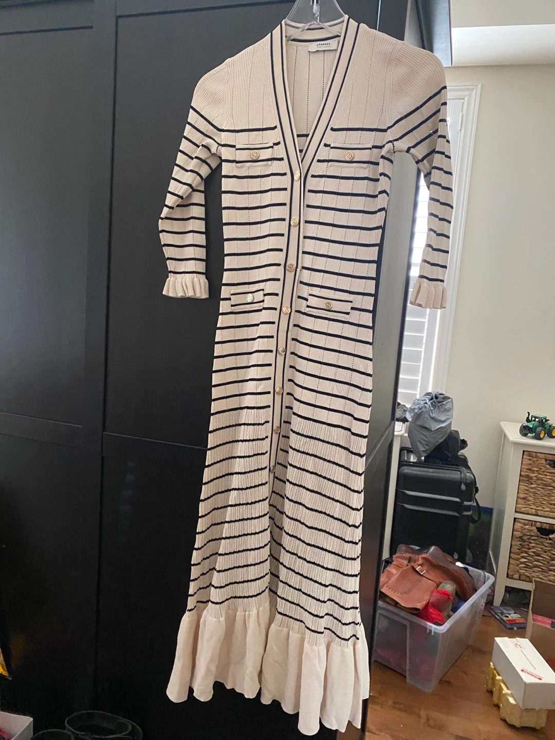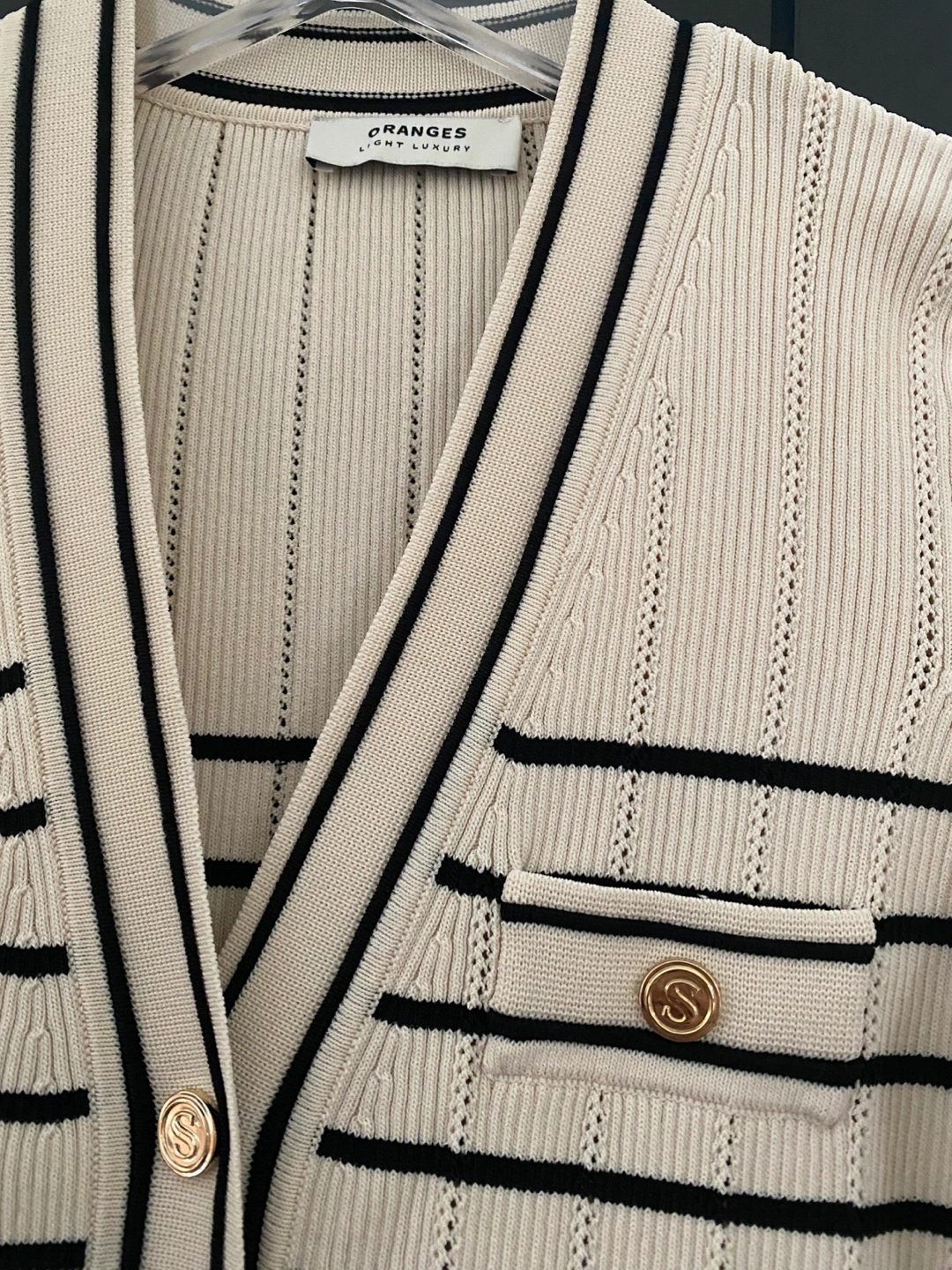 This is a lovely Oranges Knit Luxury cardigan dress. It features a striped design and gold-tone button accents. Perfect for a stylish and comfortable look!
