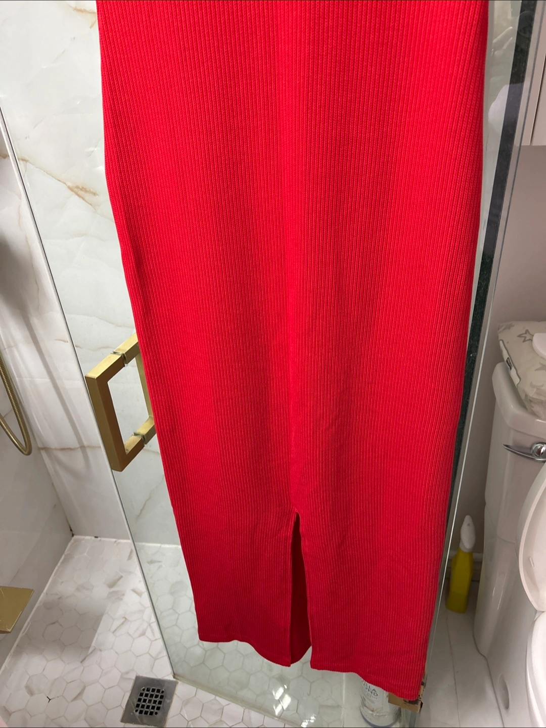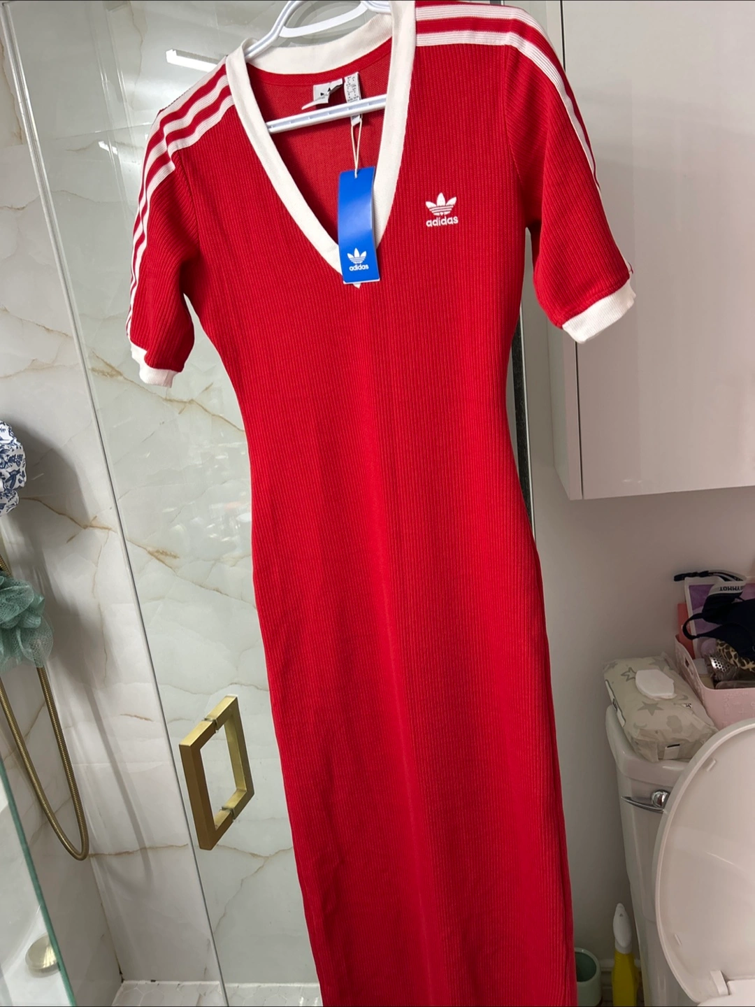 This is a red Adidas dress with white stripes on the sleeves. It has a v-neck and a ribbed texture. Perfect for a casual day out or dressing up for a night out!