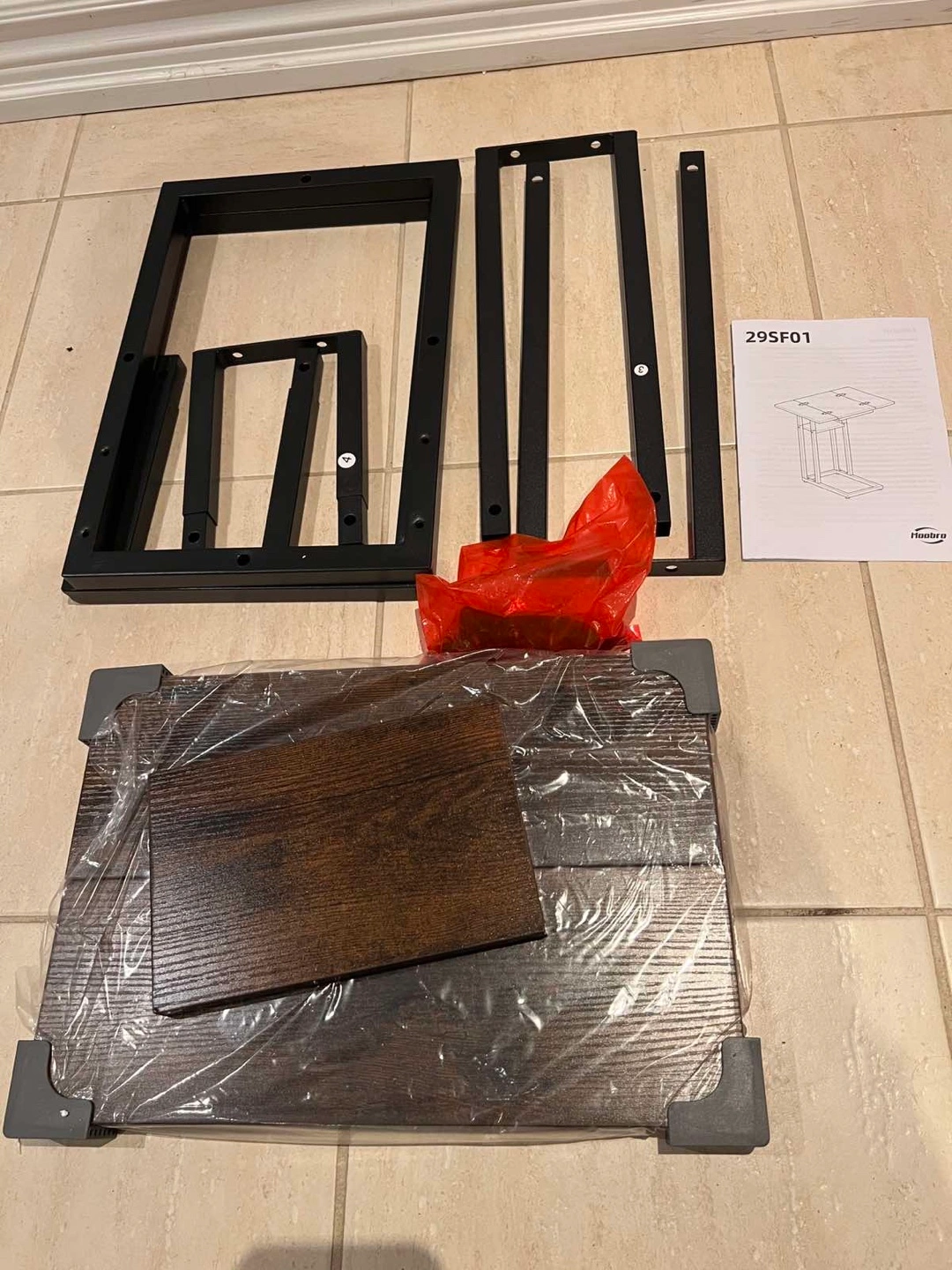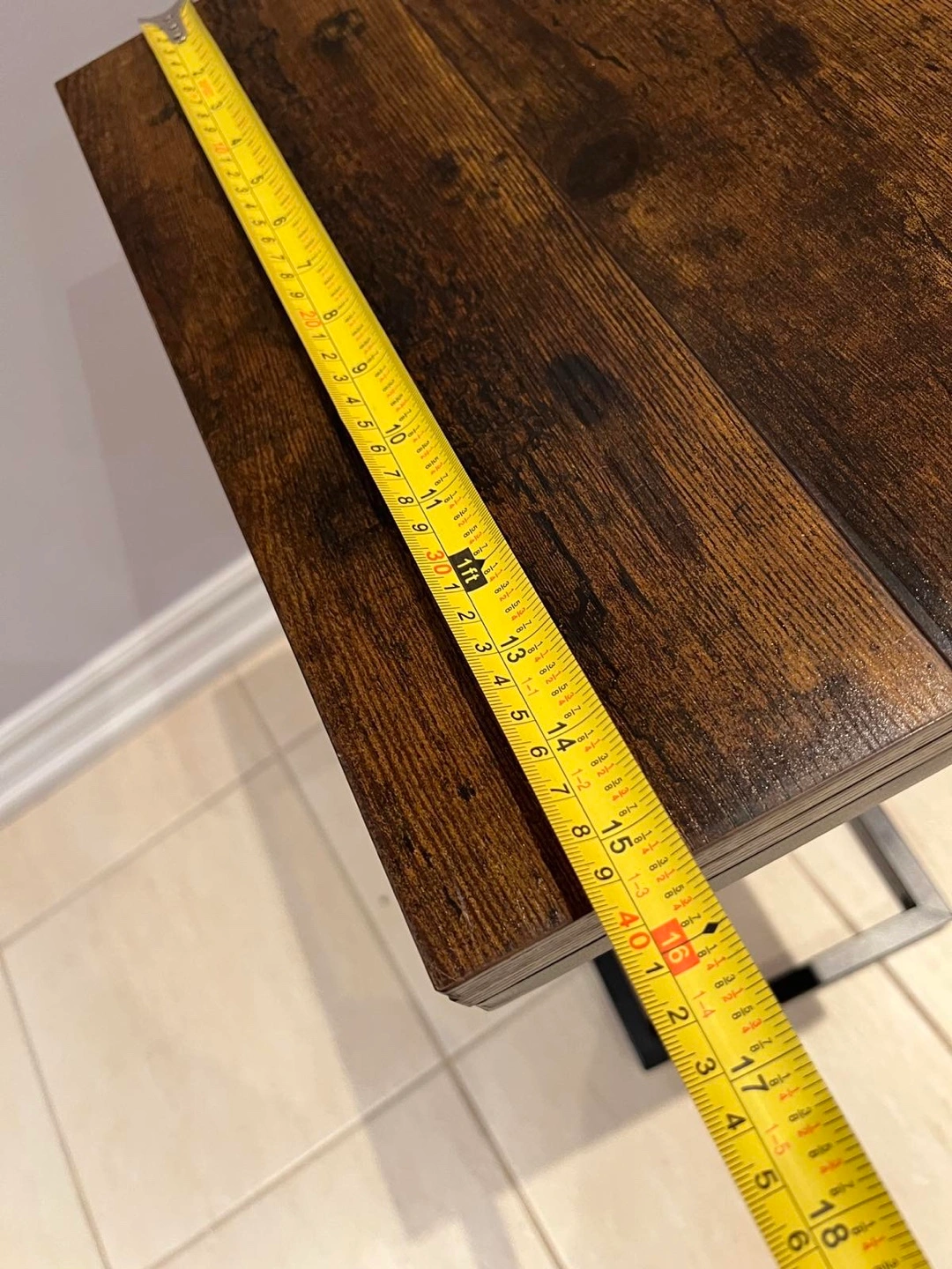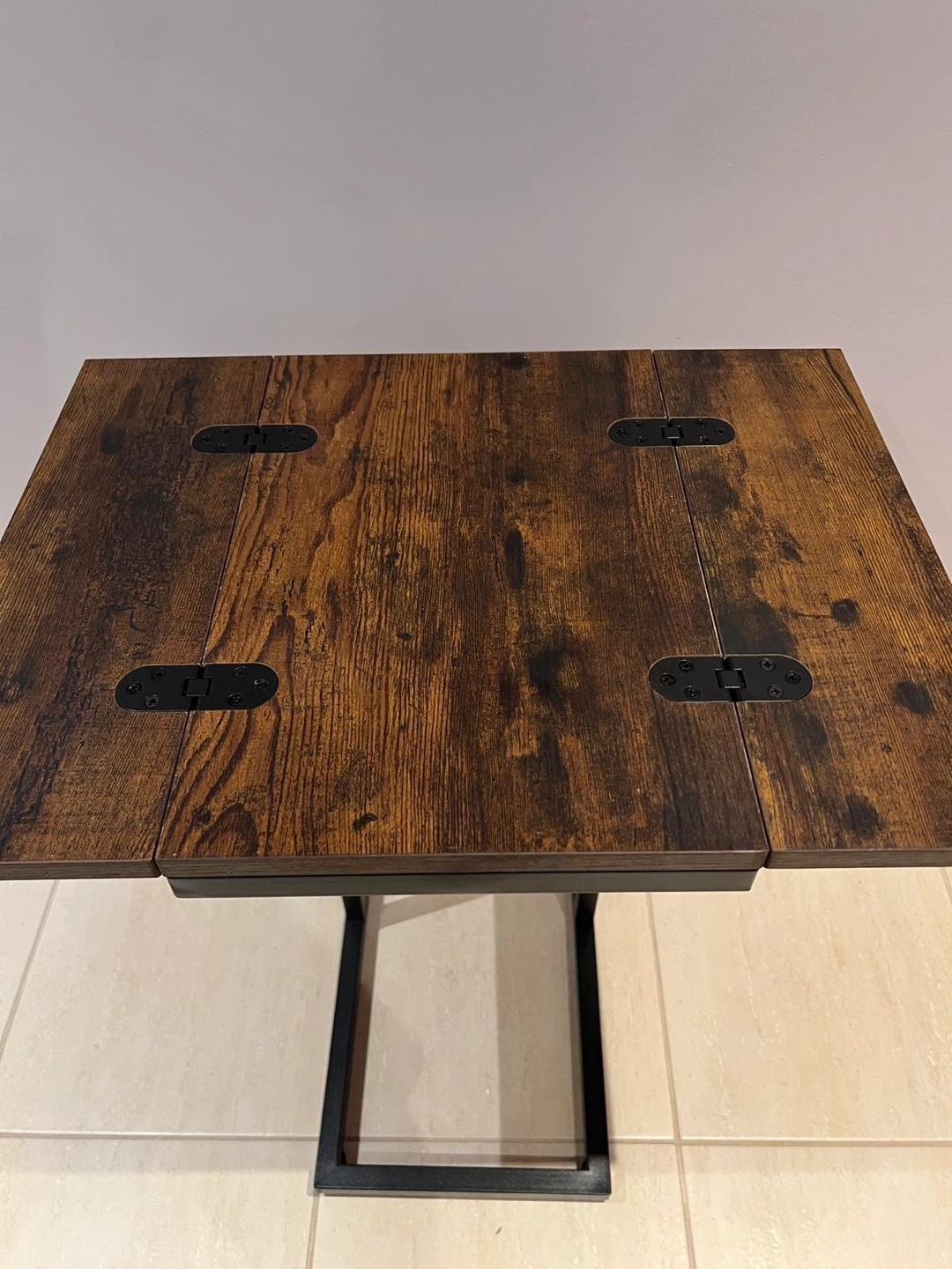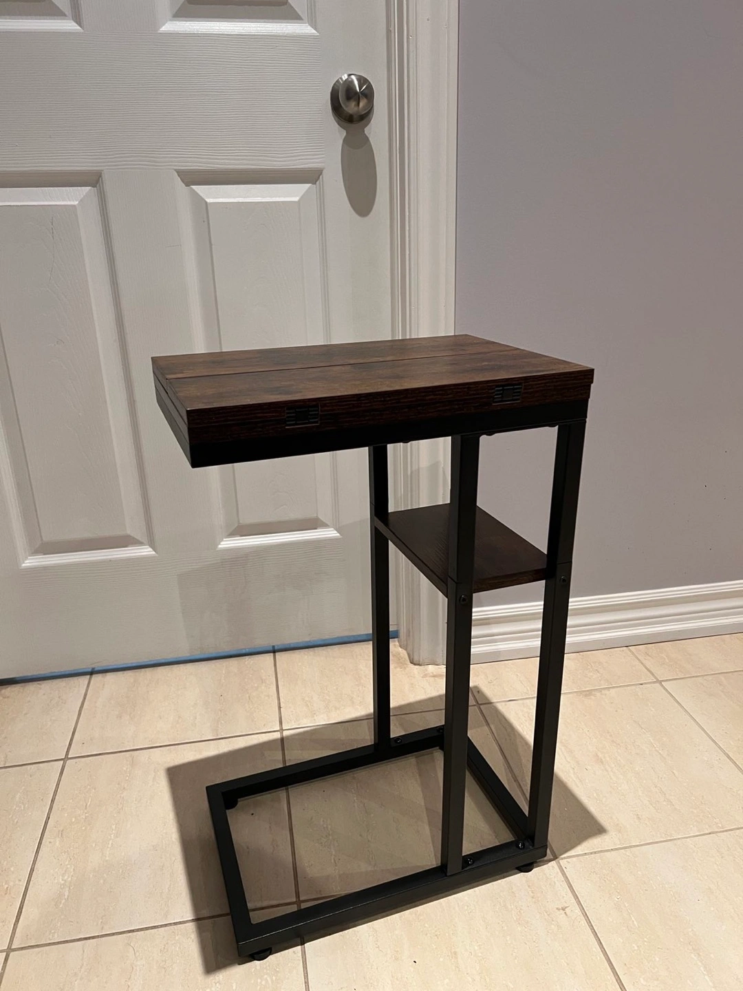 Selling a C table with a wood top and metal frame. It's in great condition and perfect for small spaces! It would be a great side table for your couch or bed.