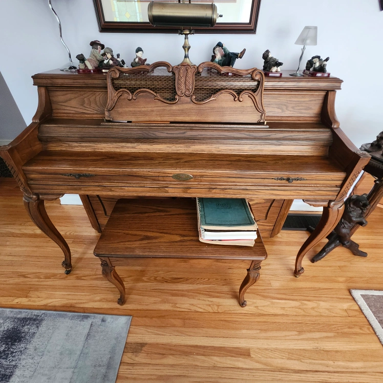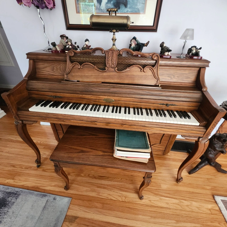 Selling a Wurlitzer upright piano. It's a beautiful piece of furniture and a functional instrument. It has a classic look with a warm, wood finish. Perfect for someone who loves music and vintage decor!