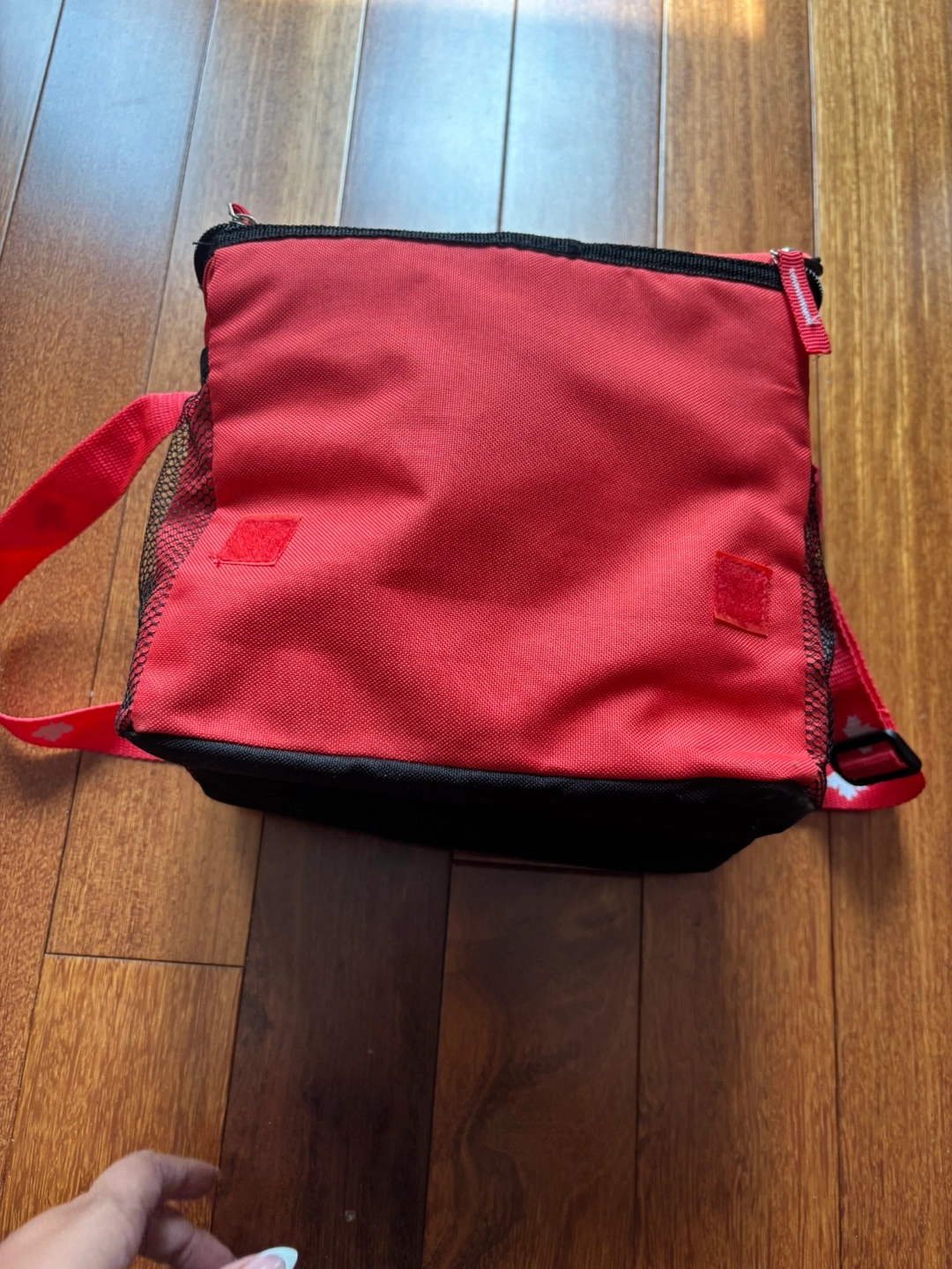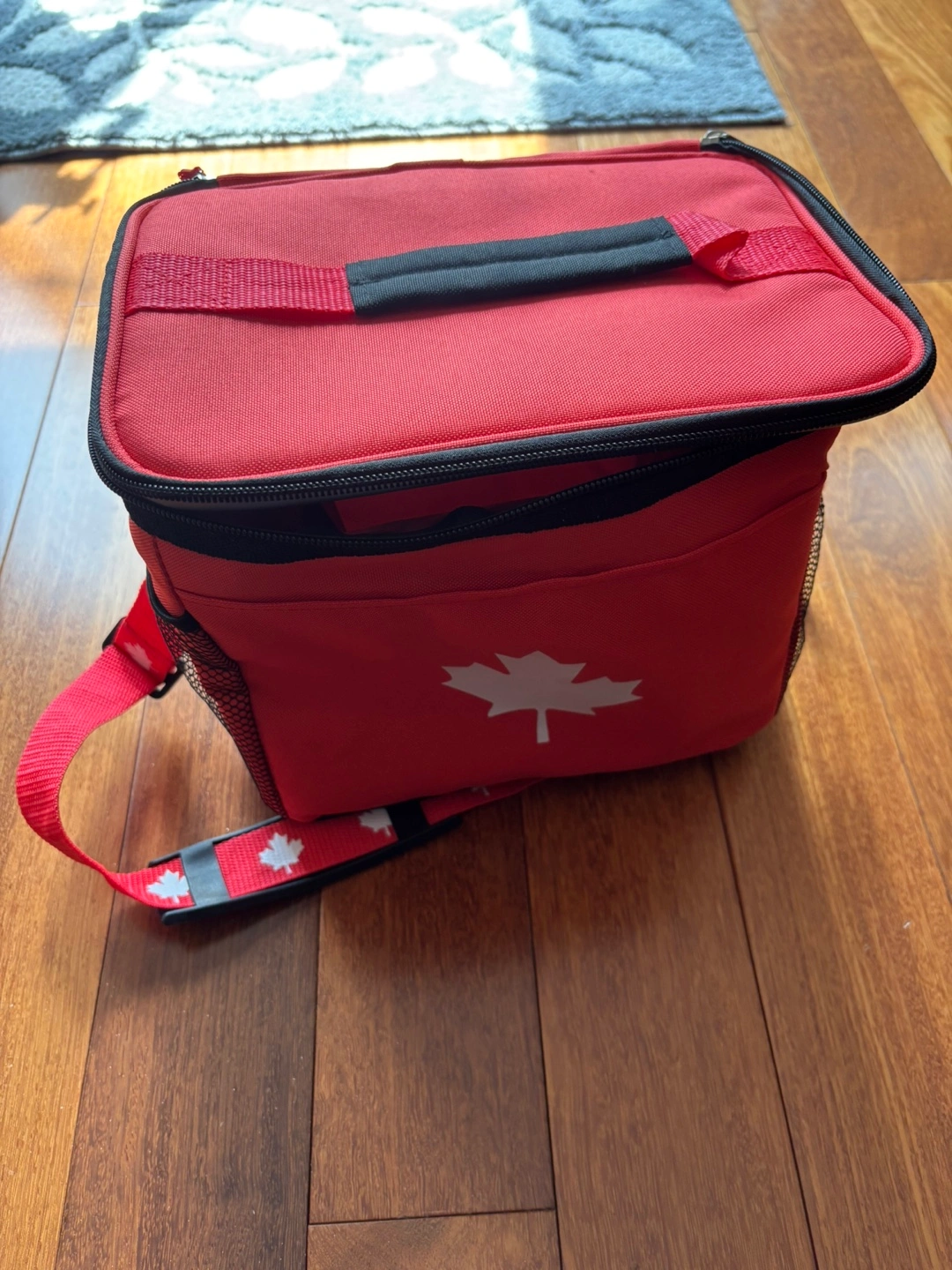 Keep your lunch cool with this red lunch bag! It features a white maple leaf design and a convenient shoulder strap with maple leaf detailing. Perfect for work, school, or picnics