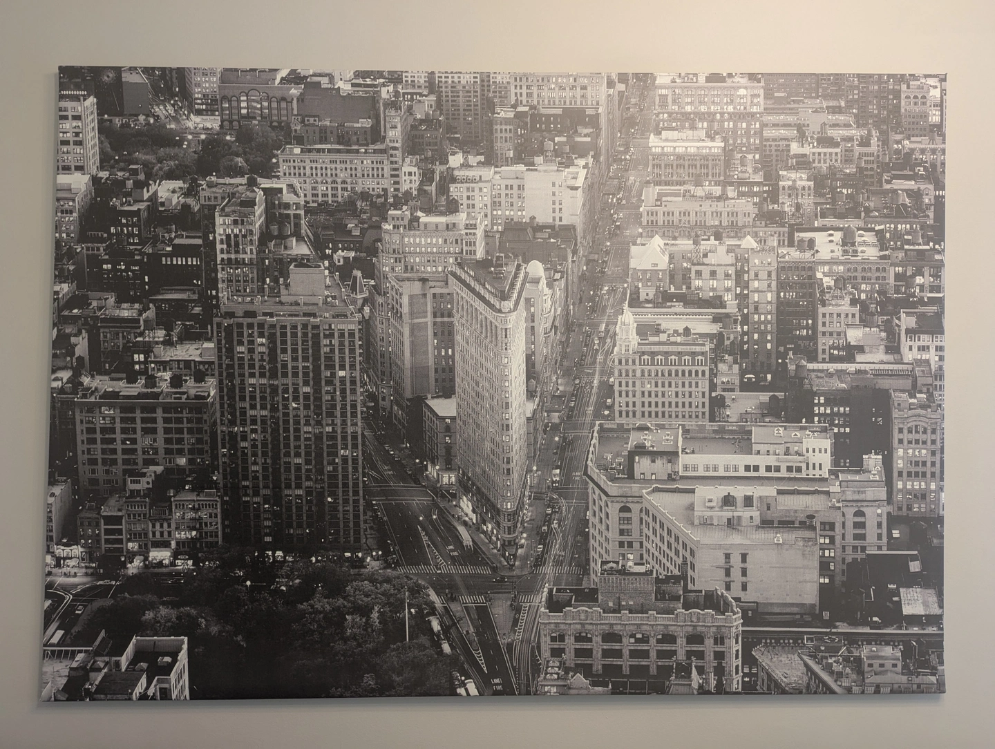 Selling a stunning large canvas print of a black and white photo of New York City. The photo features a great aerial view with the famous Flatiron Building at the center. It's a striking piece that works well in a living room, office, or bedroom. The canvas is in excellent condition and ready to hang.