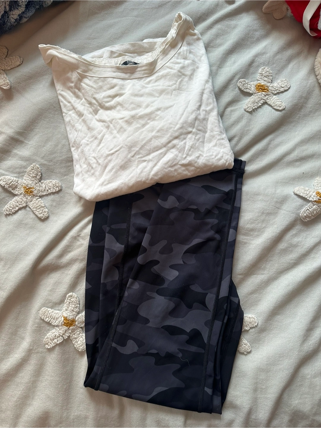 20Selling a pair of Lolë leggings with a cool camo pattern, along with a simple white t-shirt! They're in great shape and ready for a new home. Perfect for workouts or just lounging around! Size small