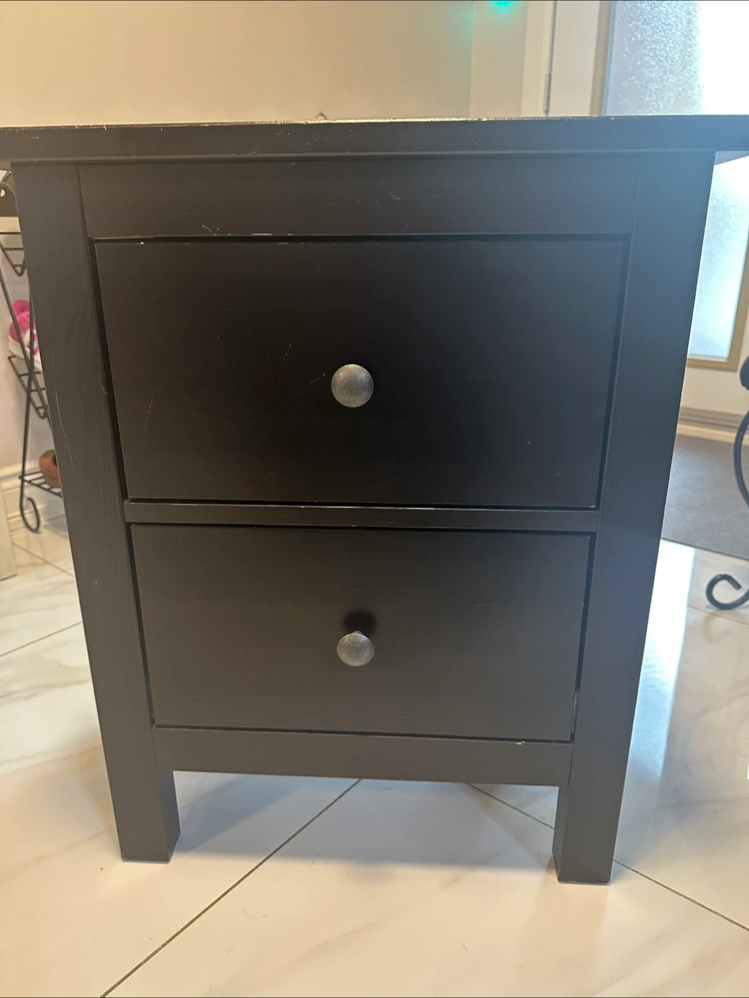 Selling a black nightstand with two drawers. It's in good condition and would be a great addition to any bedroom. The drawers offer convenient storage space.