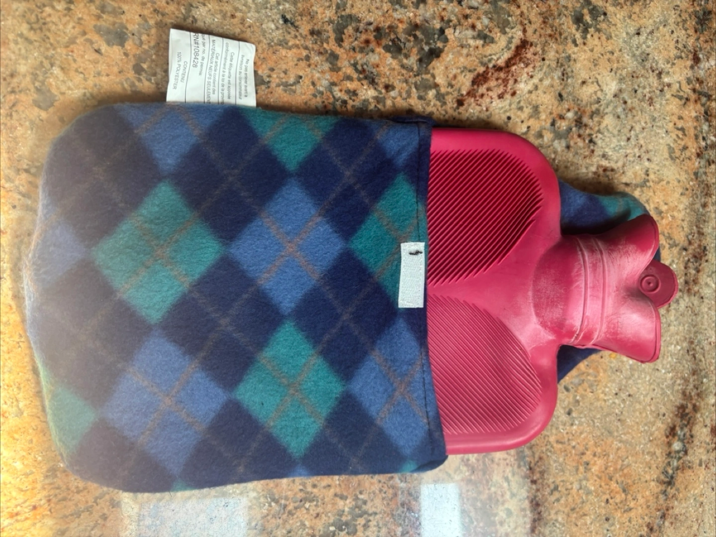 Cozy up with this hot water bottle, complete with a soft, patterned cover! It's perfect for those chilly evenings or soothing aches and pains. The cover adds an extra layer of warmth and comfort.
