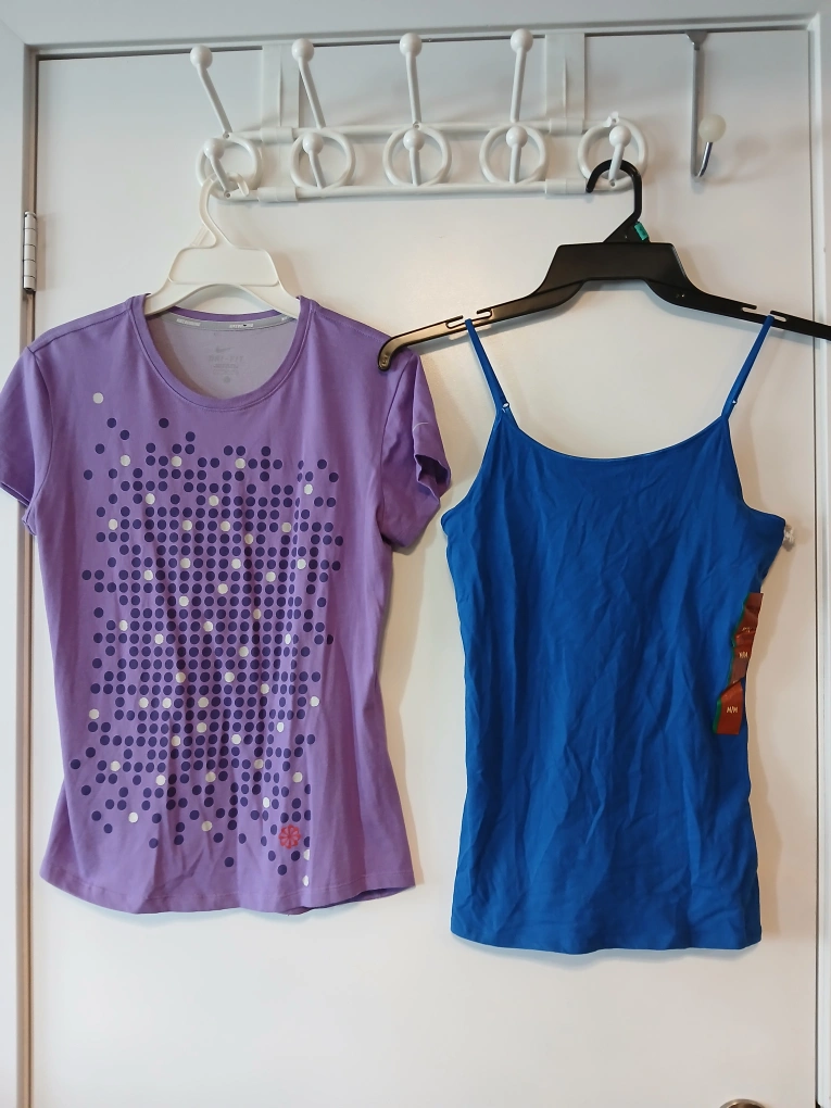 I have a Nike Dri-FIT shirt in size S.Also, a blue tank top from Mossimo Supply Co in size medium. It's brand new with tags. Ready for a new home!