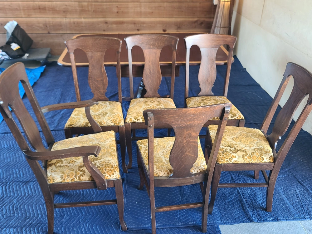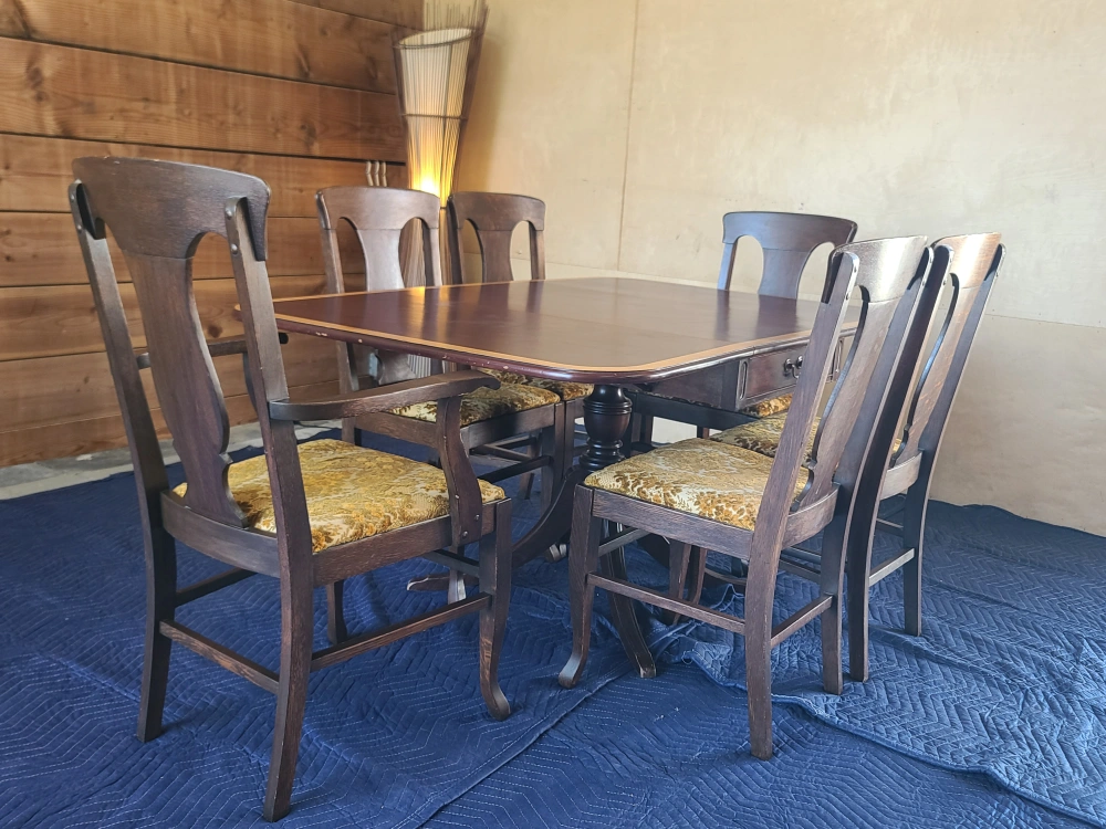 Selling a beautiful antique dining table set that includes six chairs. The chairs have a classic design with patterned upholstery. The table and chairs are made of wood, with a dark finish. Perfect for adding a touch of vintage charm to your dining room!