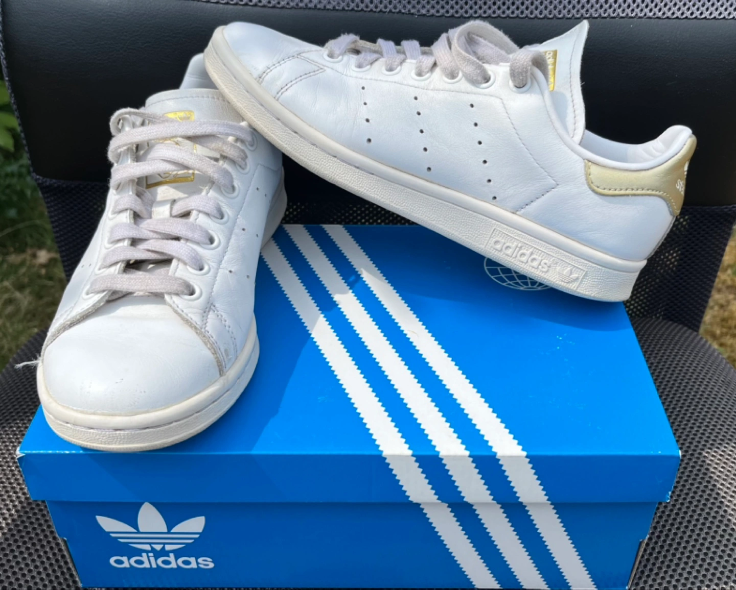 A classic Adidas women’s sneaker in the gold and white colorway with off-white midsole. This version of the sneaker is the more premium one with the softer and much more comfortable full leather and thicker tongue versus the Primegreen recycled materials version. Clean all around and from a pet and smoke free household. Good condition compared to other listings on this platform. Only $20 obo.