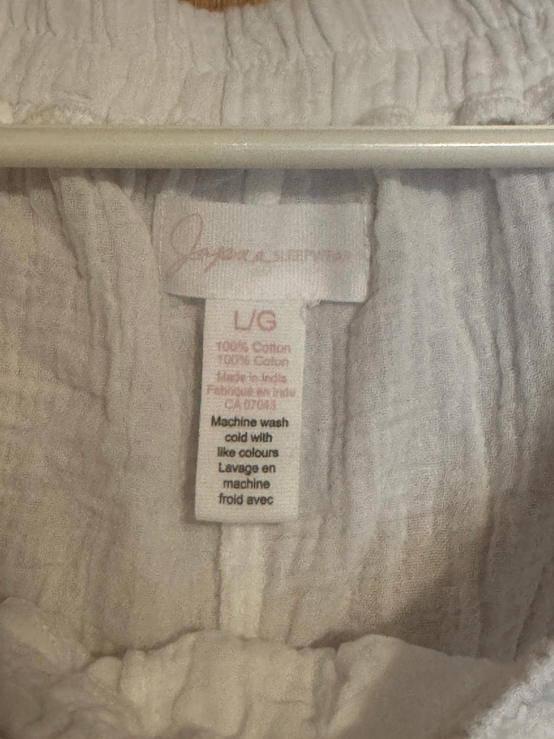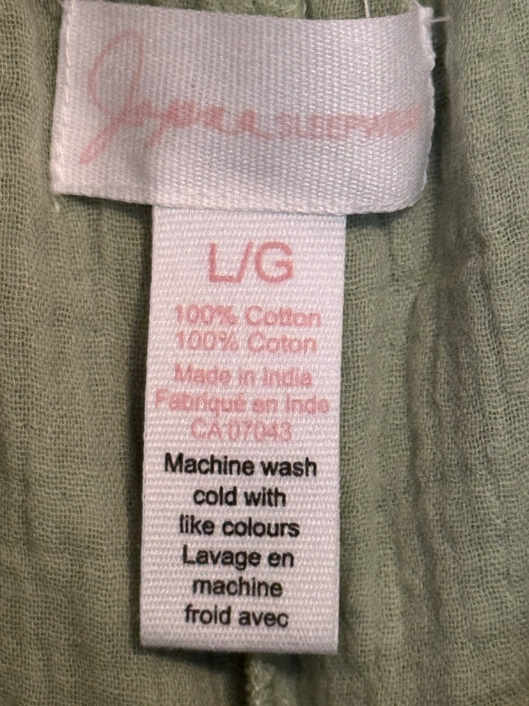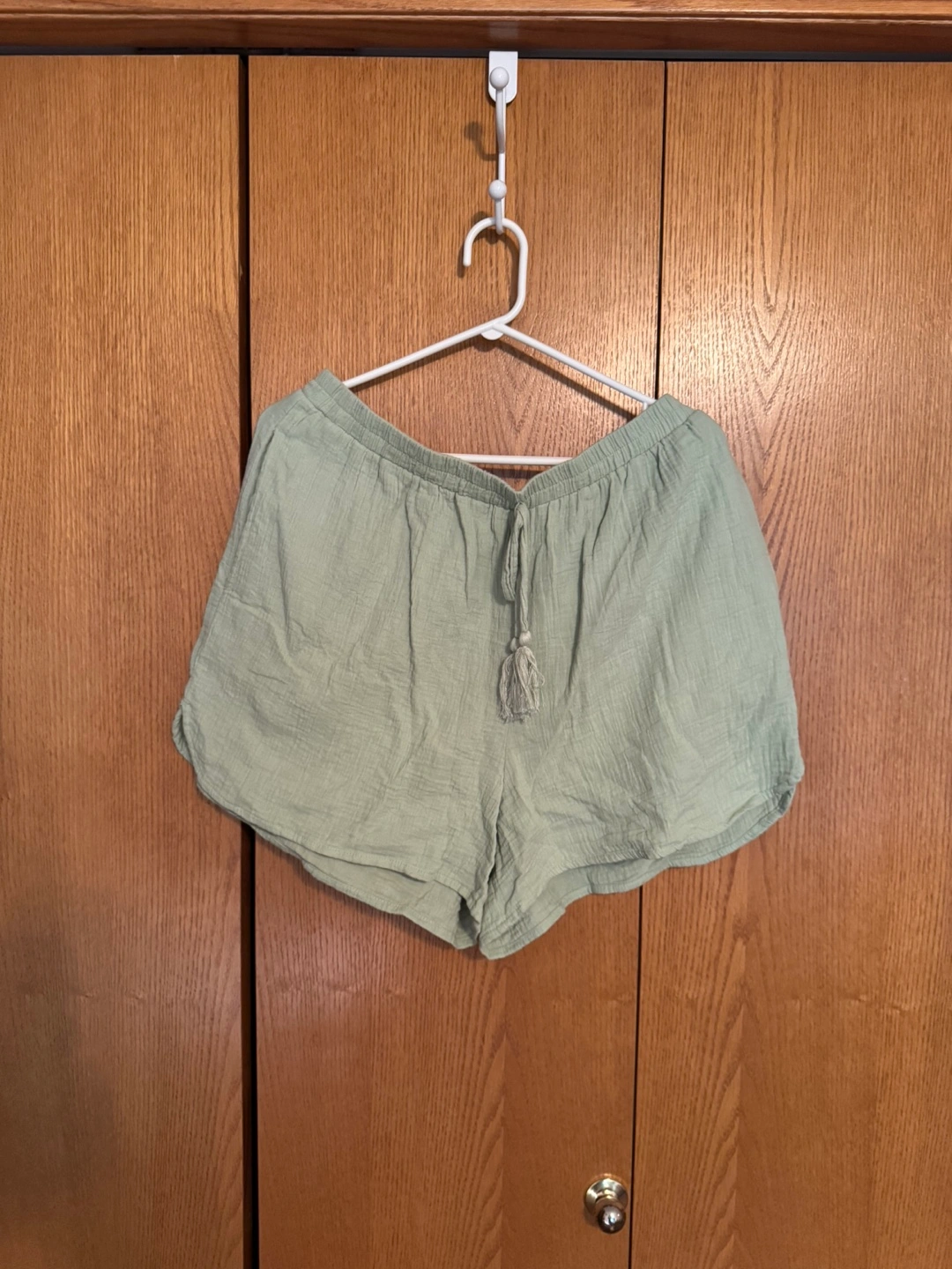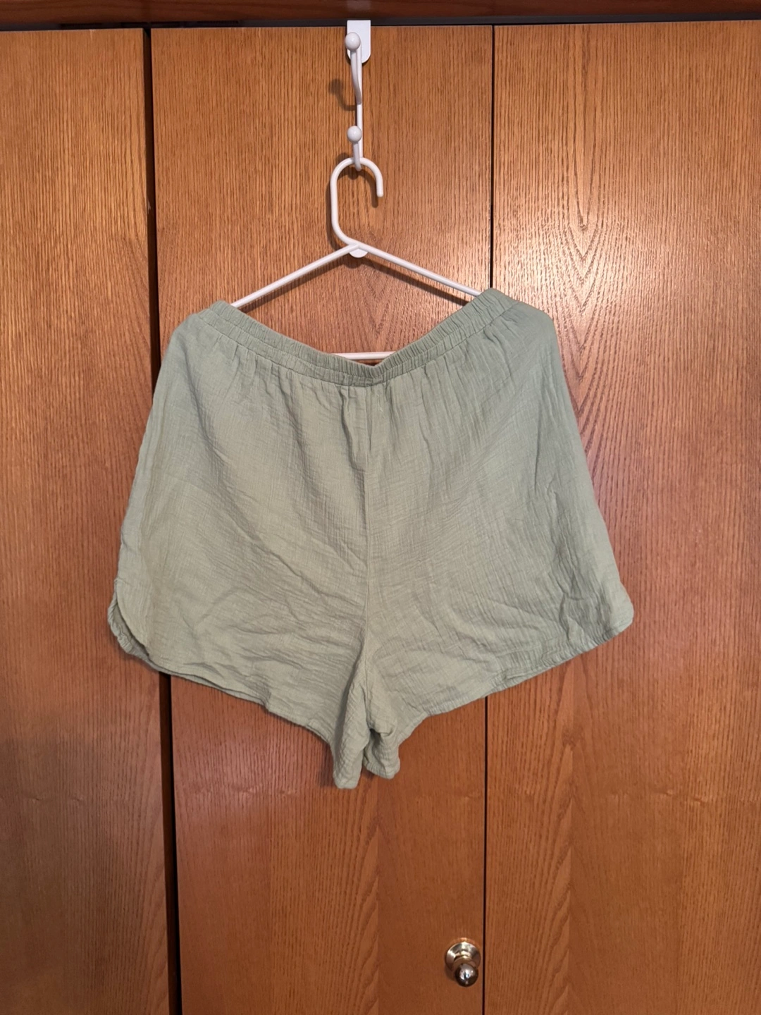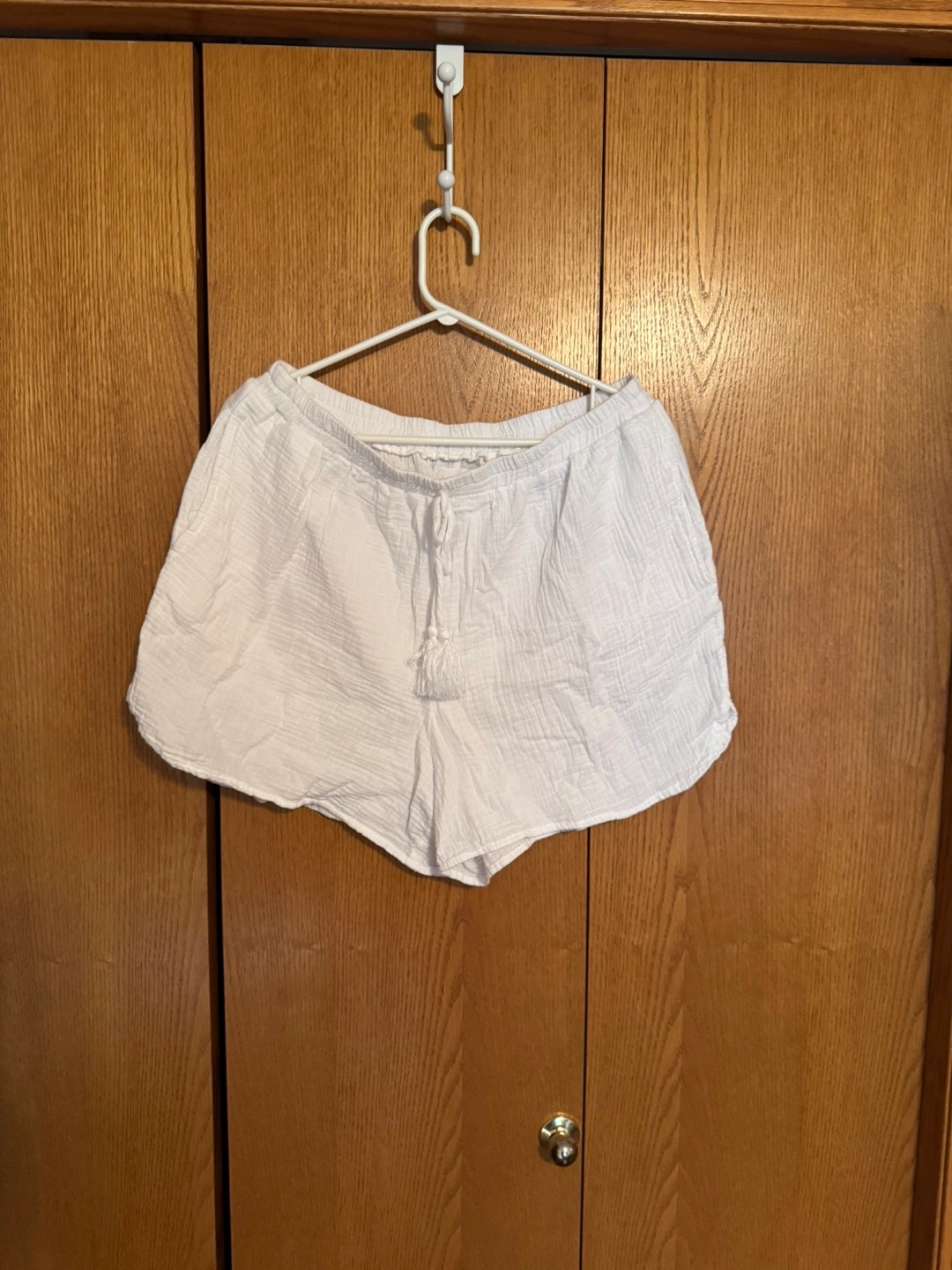 These are a couple of pairs of linen sleepwear shorts in a women's size large. One pair is a very pale green colour and the other is white. They're in new condition and the perfect comfy shorts to wear around the house.