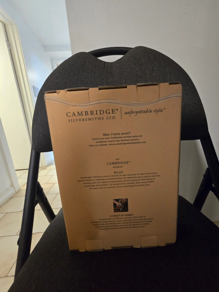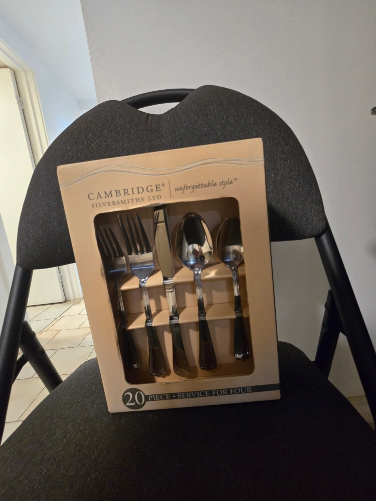 97I'm selling a brand new Cambridge Silversmiths 20-piece flatware set! This set provides service for four and comes in its original box. It's an "unforgettable style" and would look great in any home.