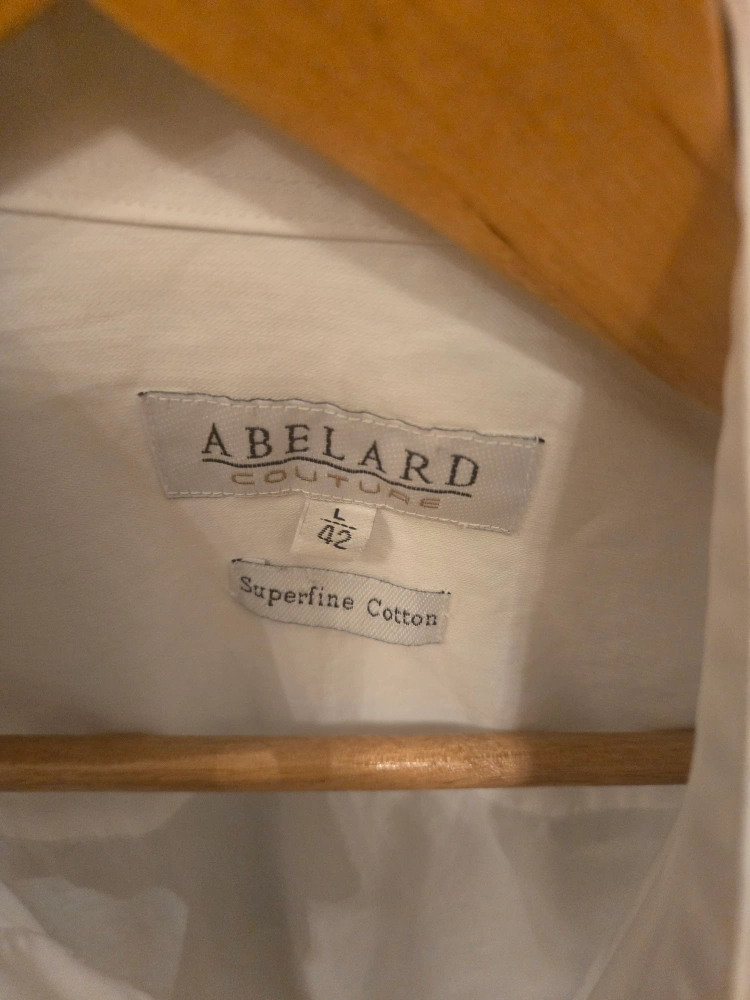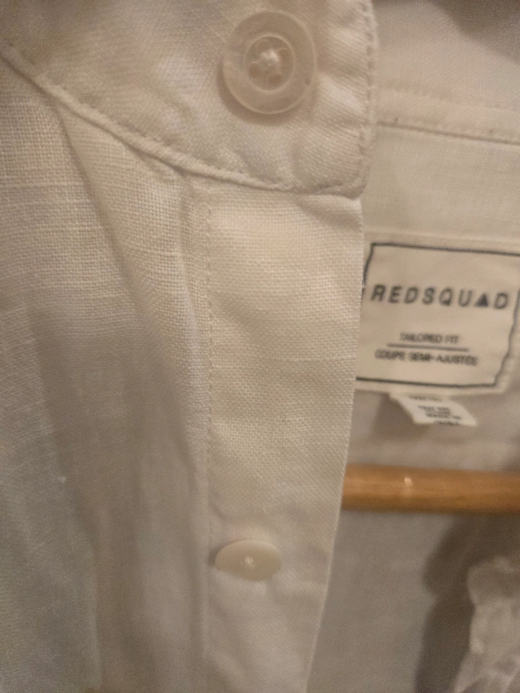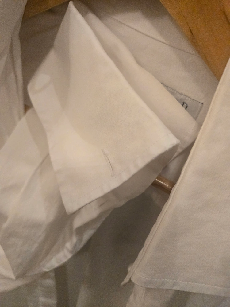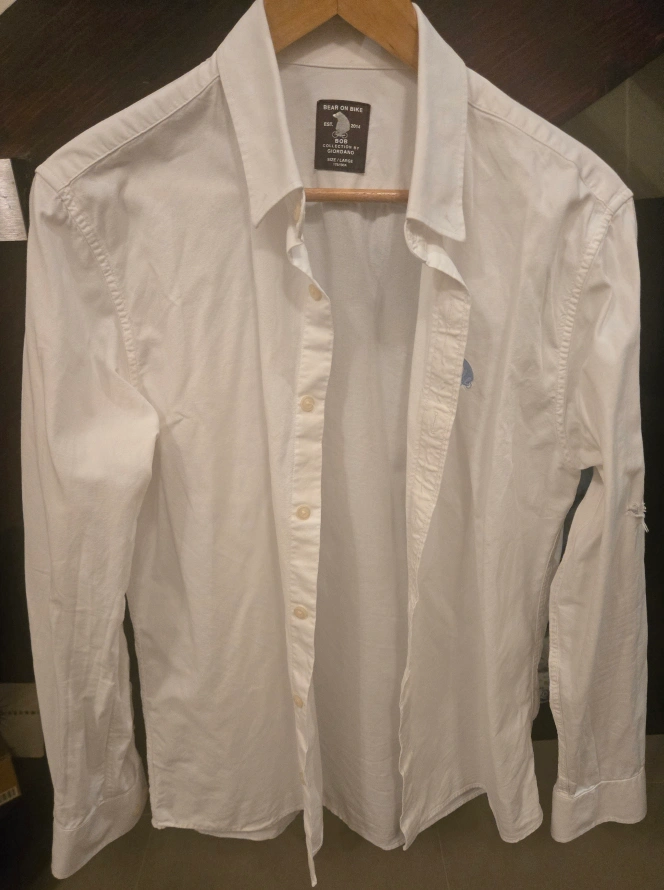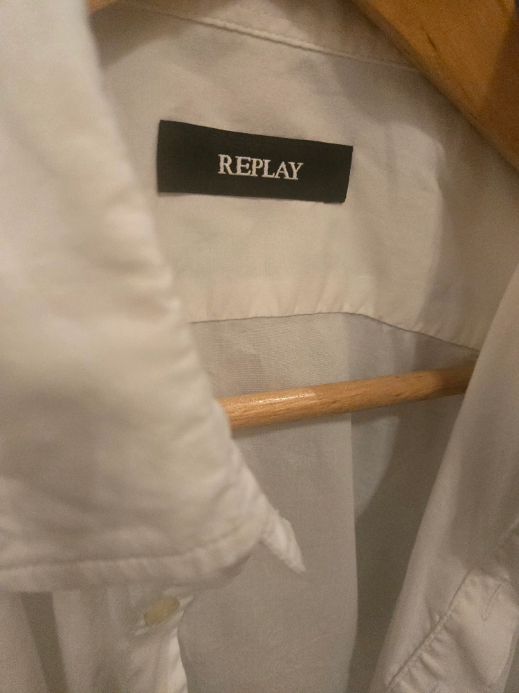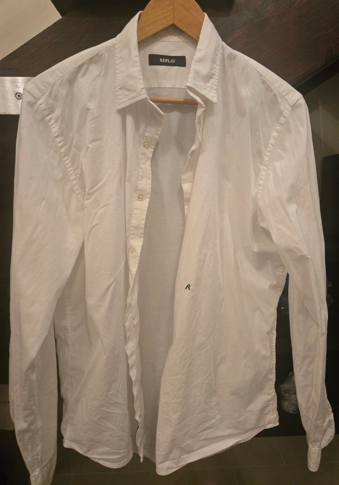 White work shirts size L, men's slim fit, and 1 other men's M relaxed fit; 4 different brands, Replay, Red square (100% linen, with mother of pearl buttons), 3rd one with French cuffs, 4th one with torn design on one sleeve; $20 for all 4; all fresh laundried, but not pressed; not selling singles, buy all 4 or nothing; cash only price firm.