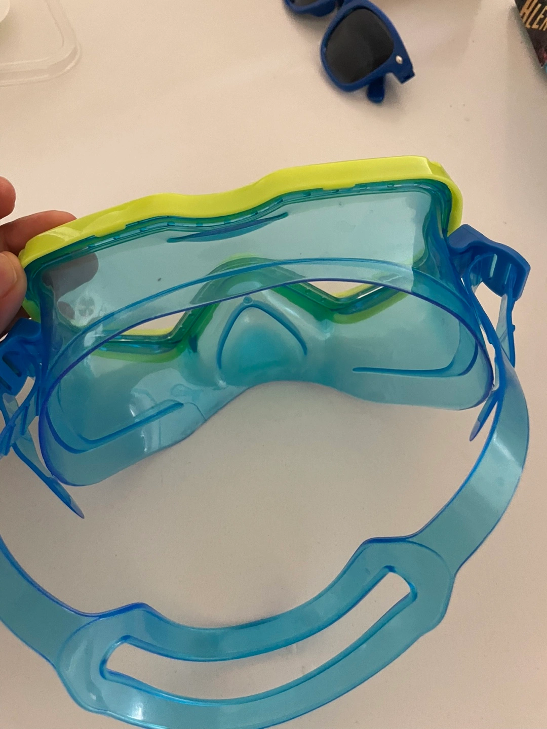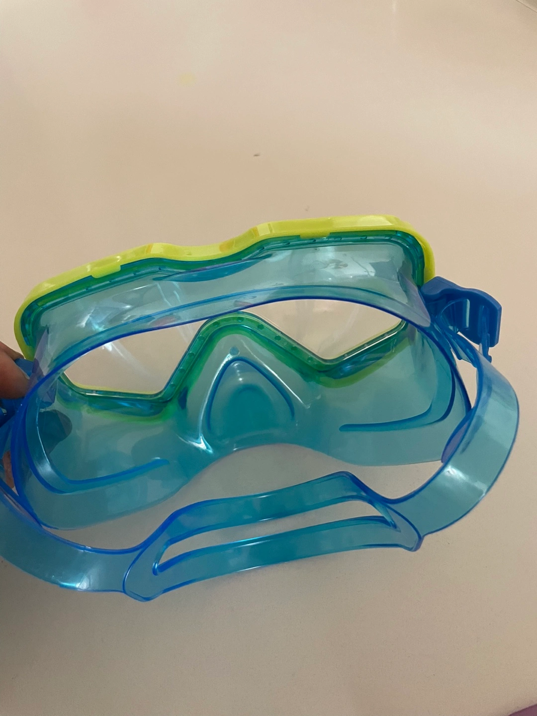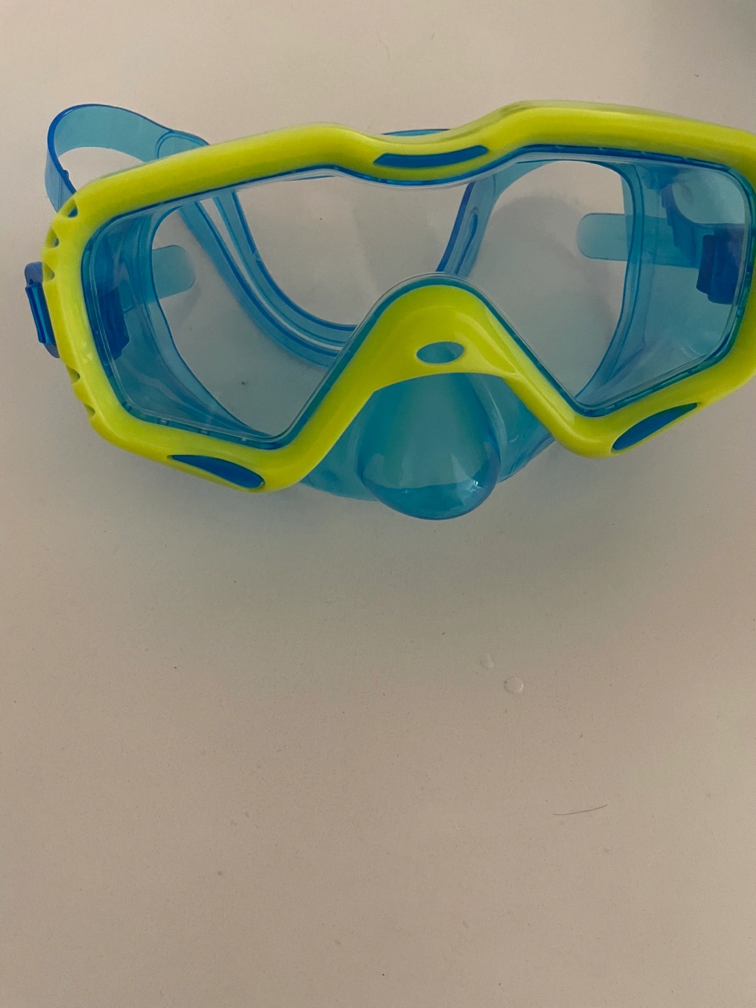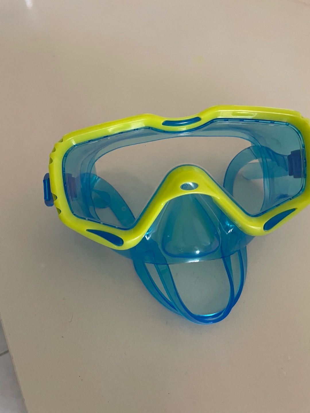677Here's a blue and yellow snorkel glass!It's in good condition and ready for your next underwater adventure
