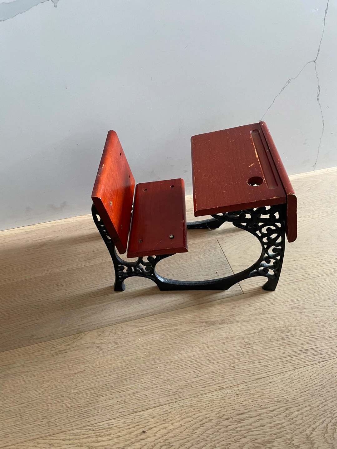 I'm selling a vintage miniature school desk! It's a charming piece with a wood finish and ornate cast iron legs. Perfect for a collector or as a unique decorative item