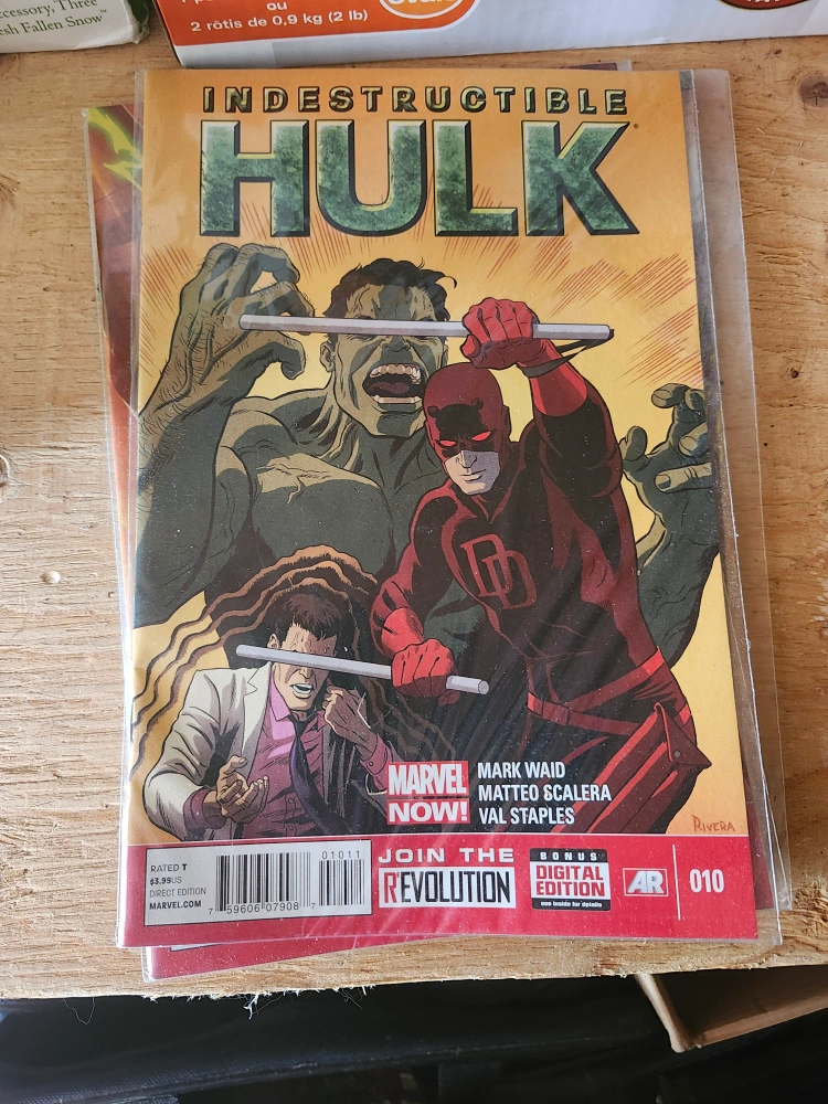 Selling the Indestructible Hulk comic book! It's rated T and the direct edition. Features art by Rivera, and writing by Mark Waid, Matteo Scalera, and Val Staples