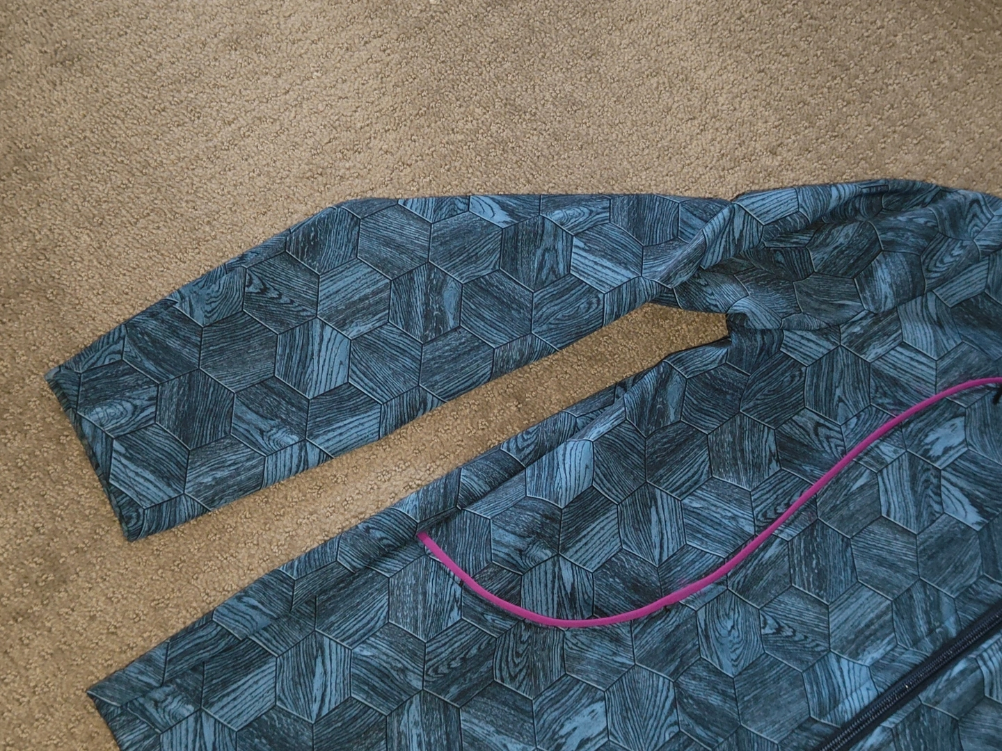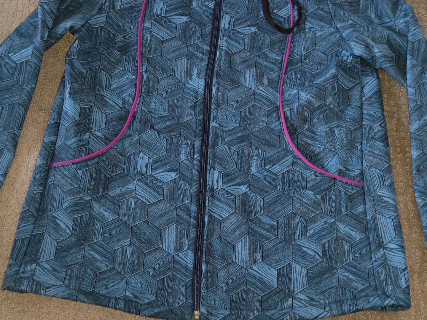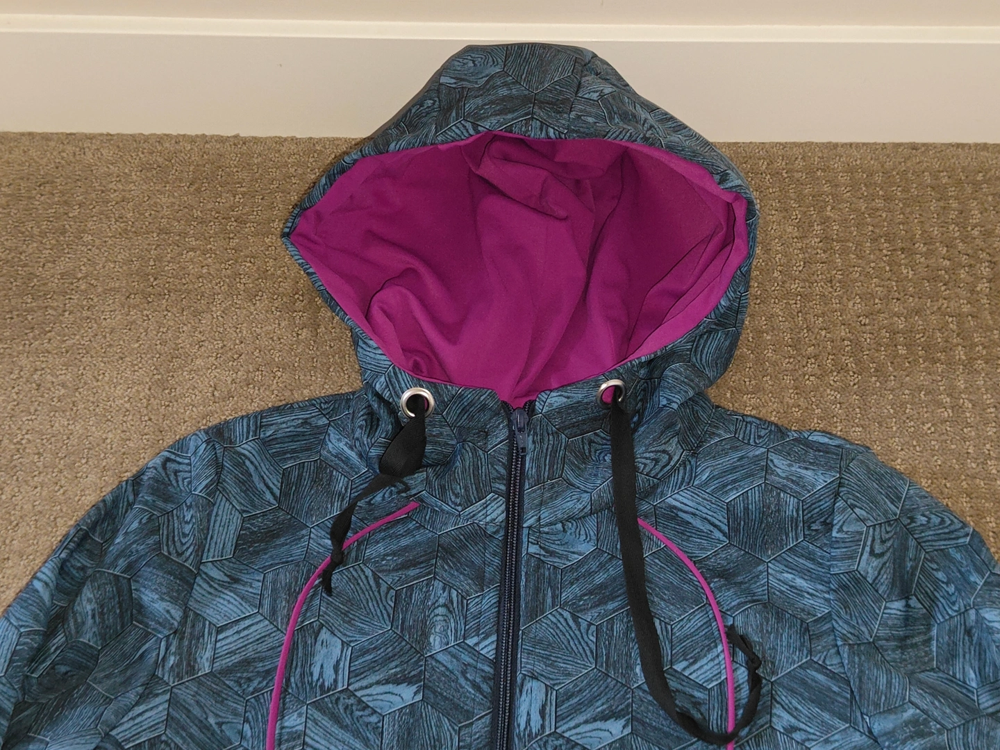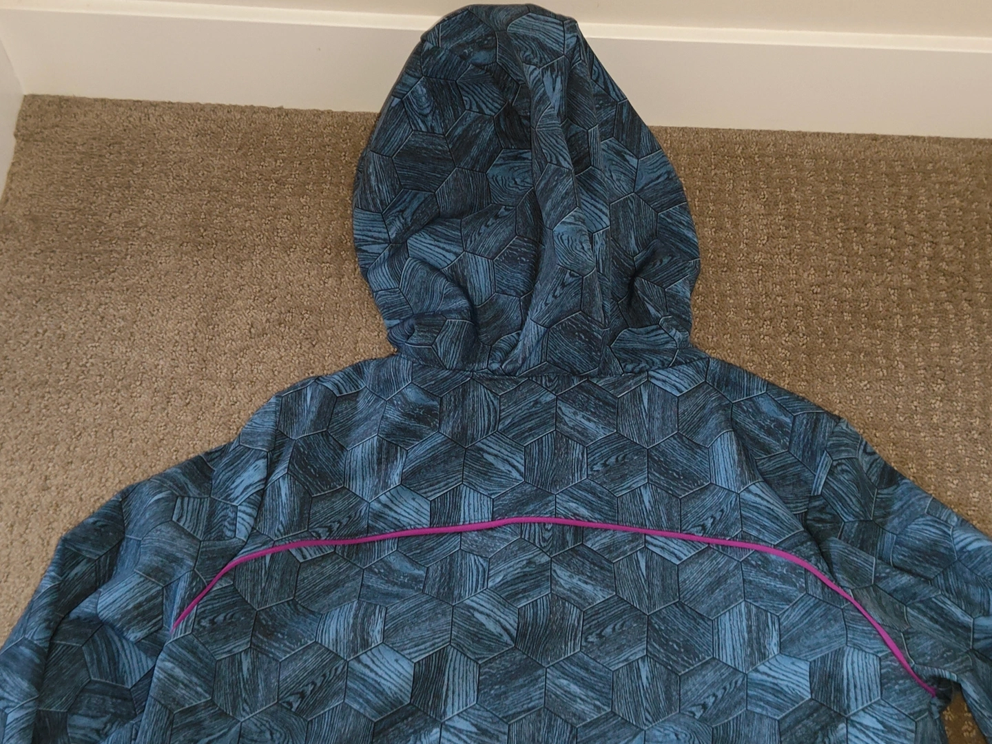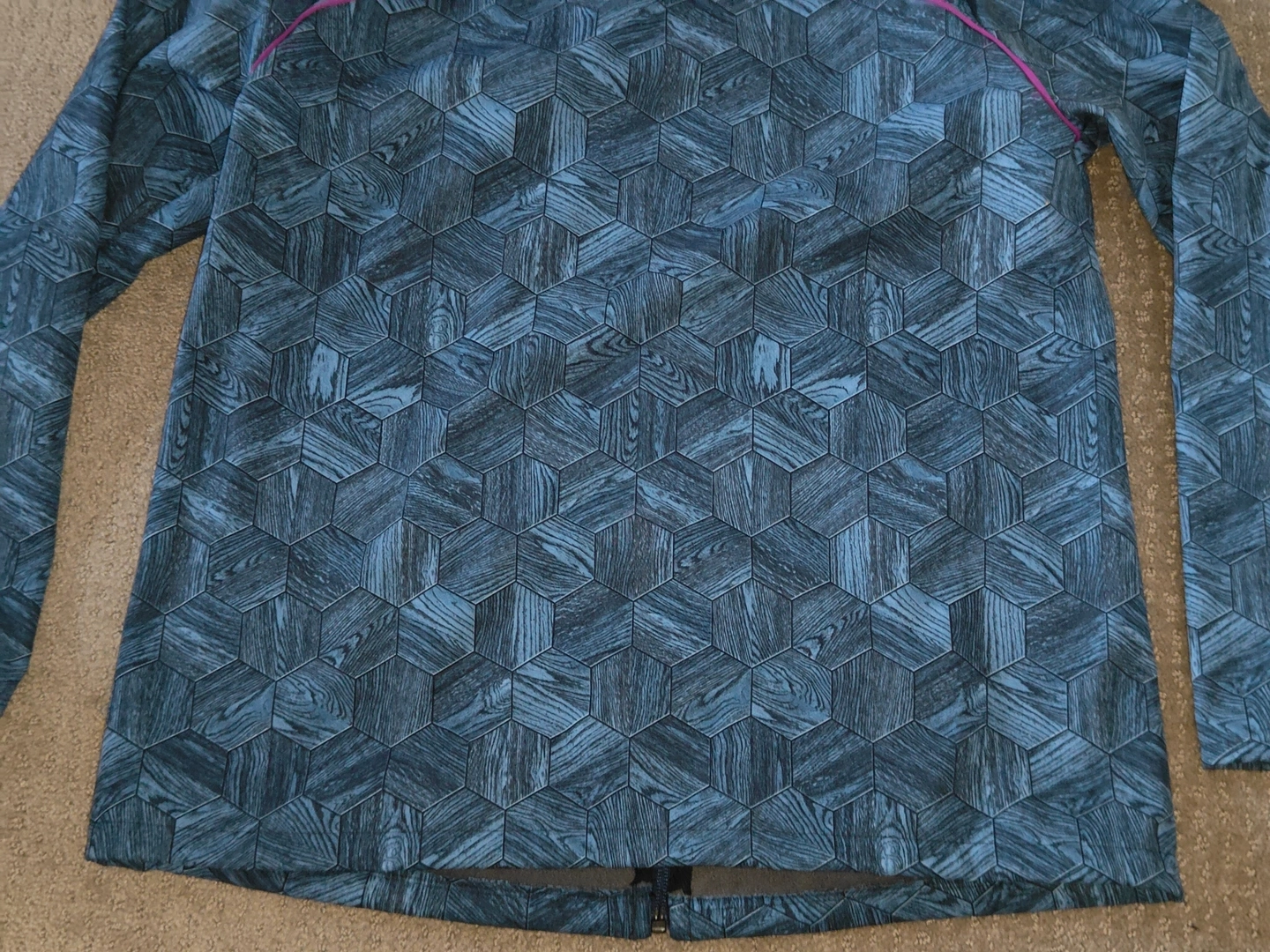 * Material Pattern: Hexagon filled with a wood grain pattern, giving the overall design a unique and interesting look. Dark teal / turquoise colour shell with magenta accents.