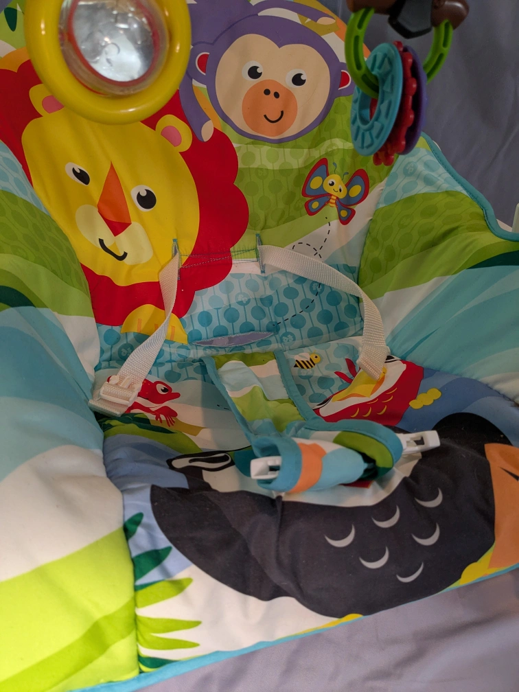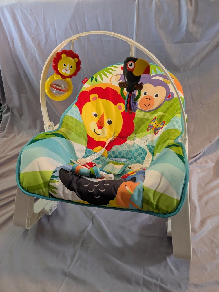 Selling a Fisher-Price Infant-to-Toddler Rocker in great condition! This rocker features a colourful jungle design with lion, monkey, and toucan characters. It's perfect for infants and toddlers alike, providing a safe and comfortable place to sit and play. The rocker also includes hanging toys to keep your little one entertained!