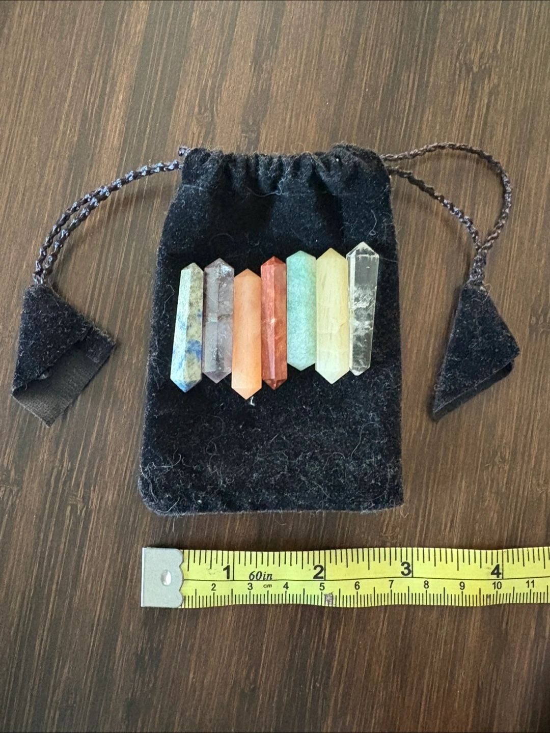 Selling a set of chakra crystals that comes with a handy black velvet bag. The set includes seven different crystals, each representing a different chakra. Perfect for meditation or energy work!