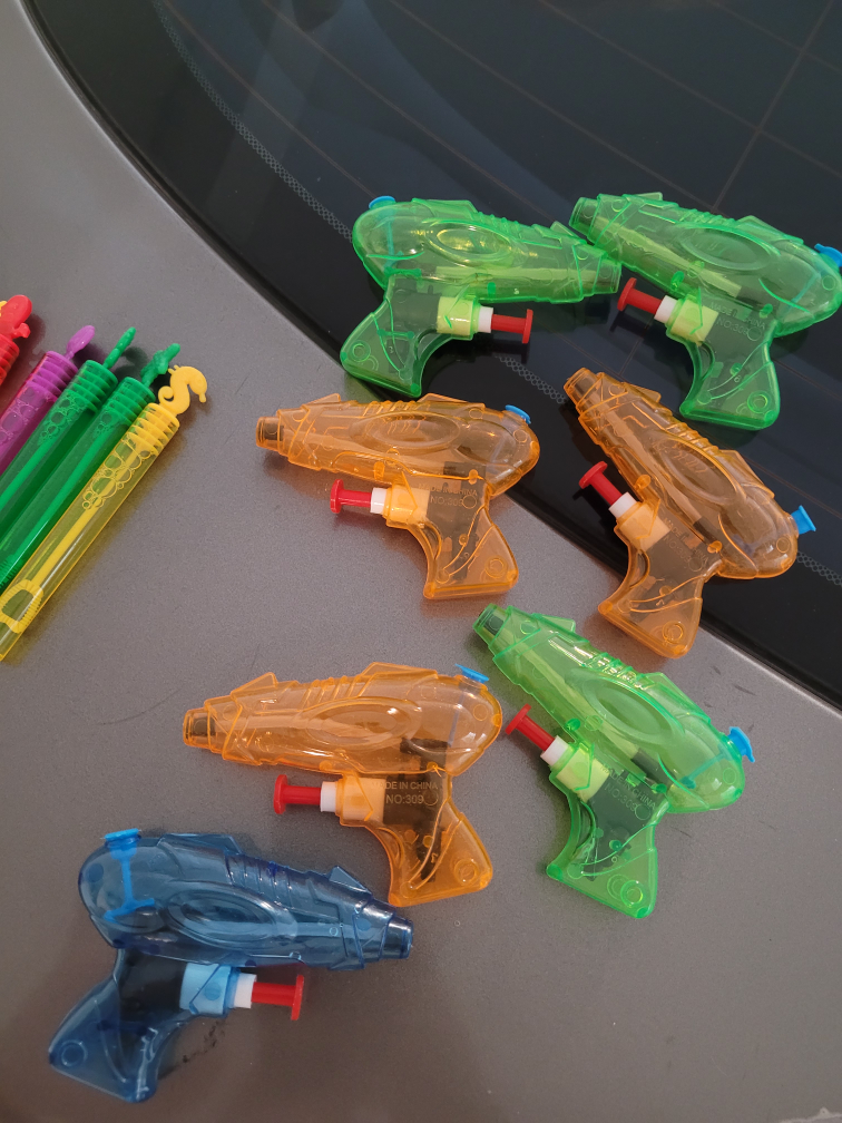 Selling a 7 colourful mini water guns! There are green, orange, and blue ones available. Great for summer fun