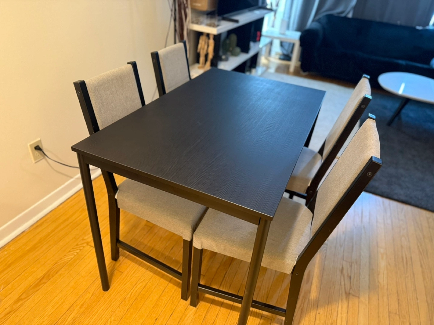 Selling a dining table with four chairs. The chairs are a neutral grey colour and the table is currently covered with a protective plastic sheet. Great set for a small dining area!