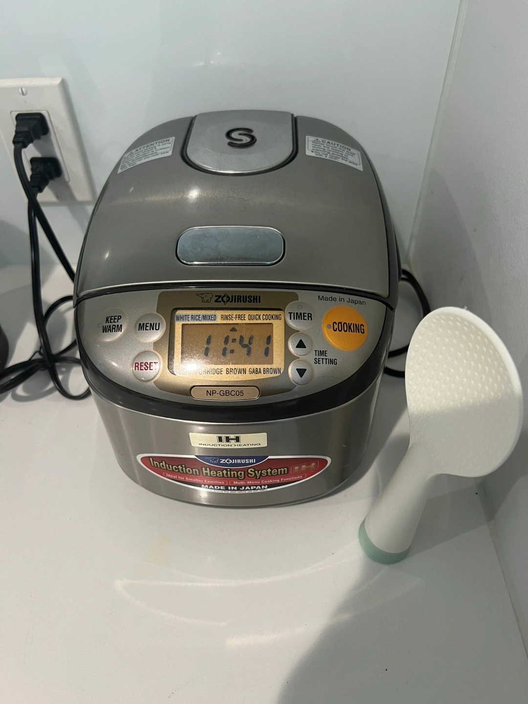 Selling a Zojirushi rice cooker, model NP-GBC05. It features induction heating and multiple cooking functions for white rice, mixed rice, sushi, porridge, brown rice, and GABA brown rice. It's perfect for smaller families!