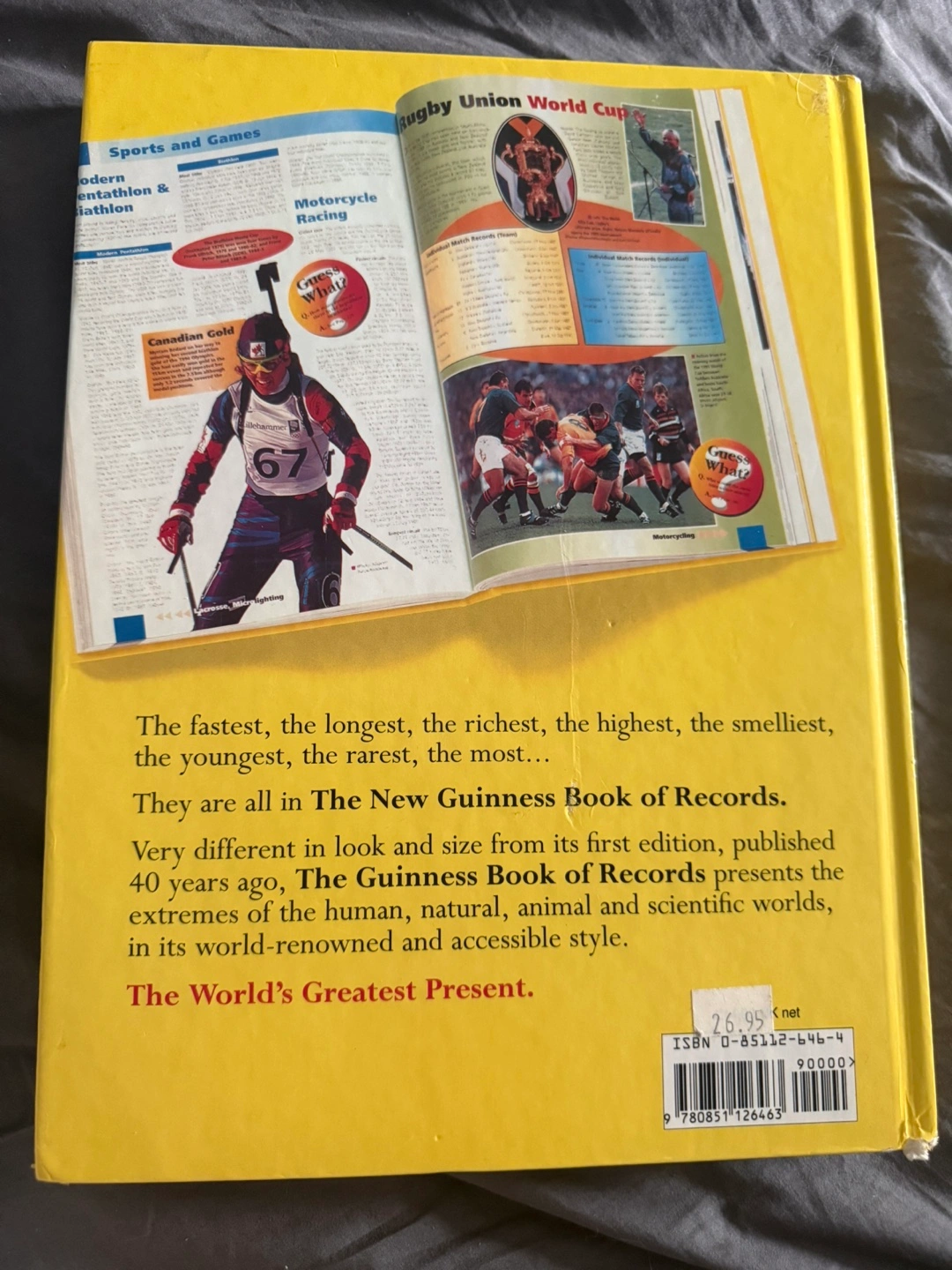 Selling copy of The Guinness Book of Records from 1996! The book presents the extremes of the human, natural, animal and scientific worlds in a world-renowned and accessible style.