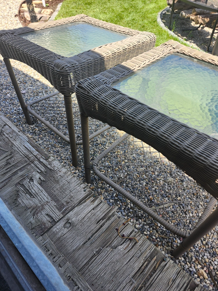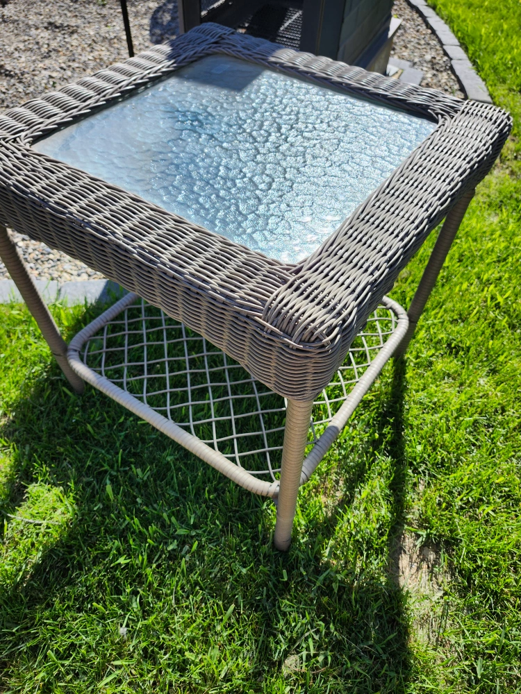 Selling a cute wicker side table setting perfect for your patio or garden! It has a glass top and a woven design with bottom shelf. There in mint condition and ready to add some charm to your outdoor space