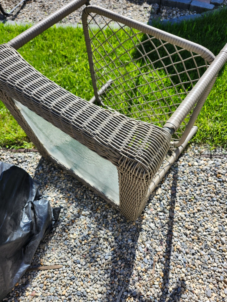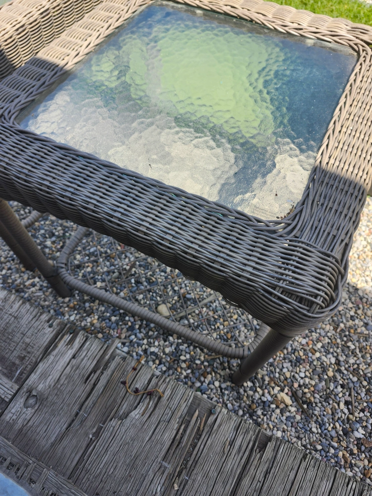 Selling a cute wicker side table setting perfect for your patio or garden! It has a glass top and a woven design with bottom shelf. There in mint condition and ready to add some charm to your outdoor space
