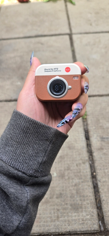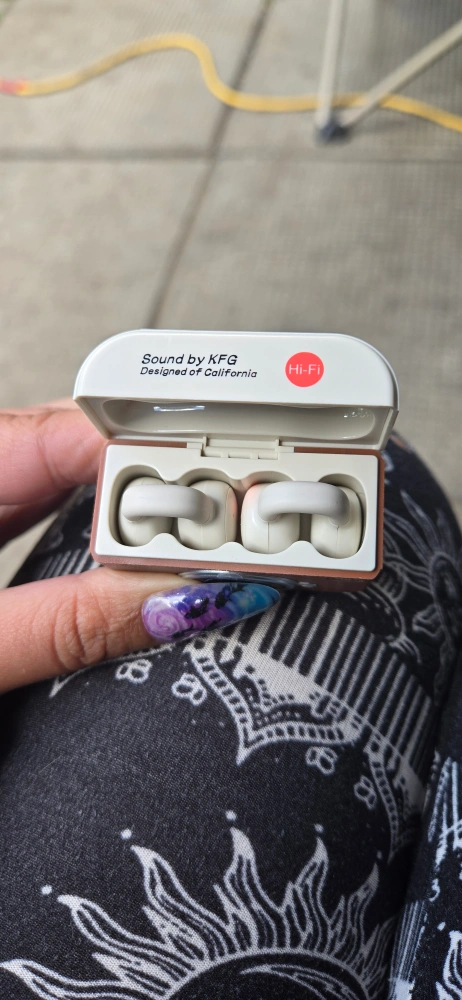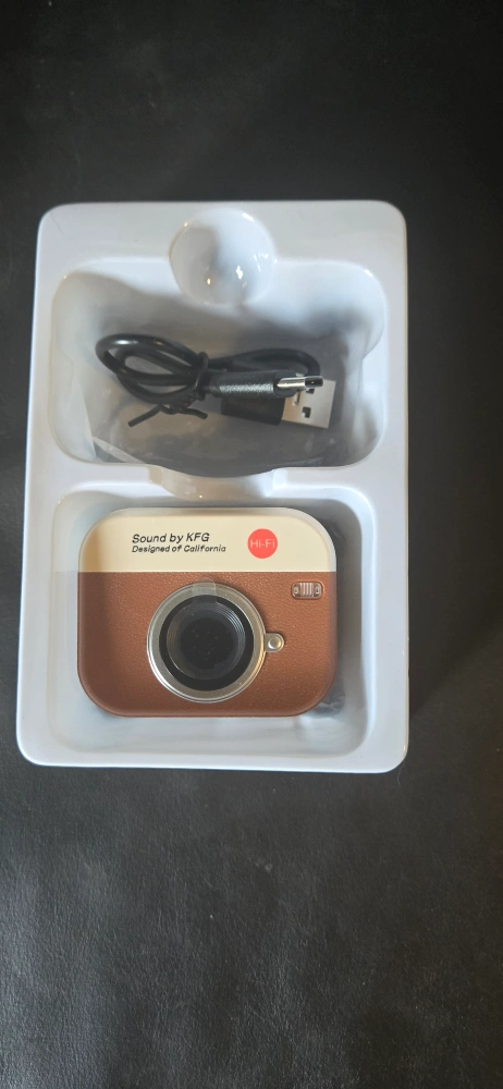 Selling a pair of KFG earbuds by New Senyang. These earbuds have a unique camera-like design and come with a charging cable. They are designed in California and offer Hi-Fi sound quality. The original box is included as well