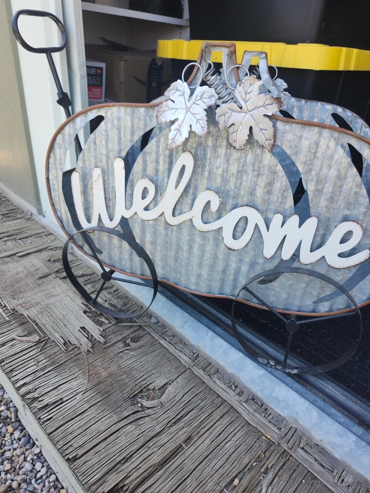 Cute metal 'Welcome' pumpkin cart for your fall decor! It's a fun way to add some seasonal charm to your porch or garden