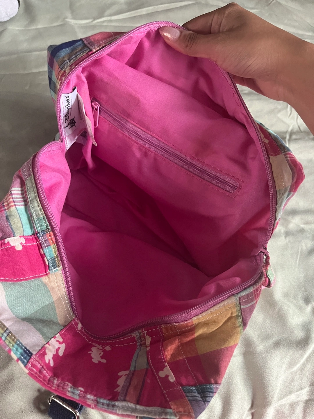 Selling a cute Disney Parks backpack featuring a colourful plaid pattern and Mickey Mouse designs! It has a pink interior lining and is perfect for carrying small items. Great for Disney fans!