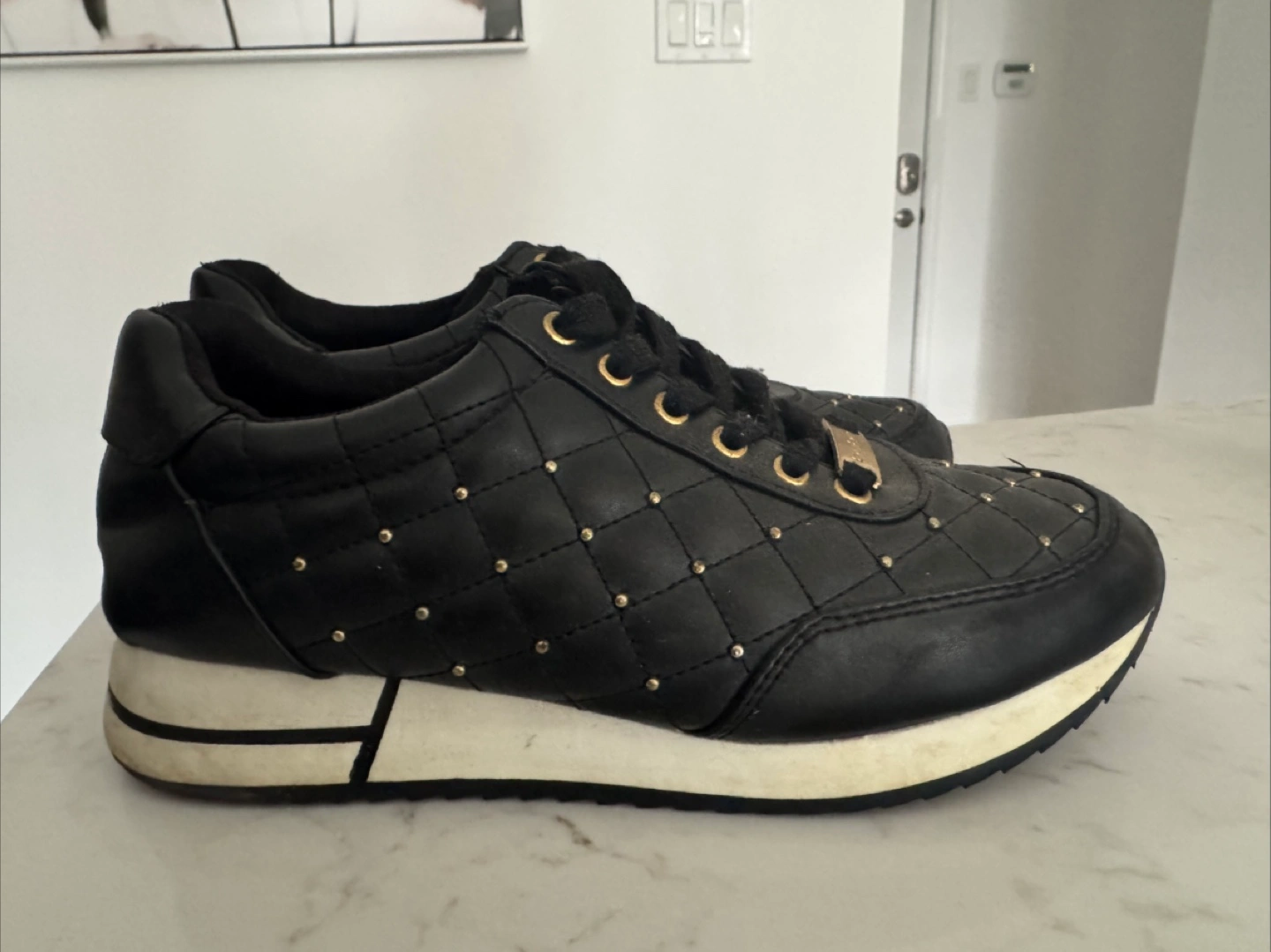 Selling a pair of Bebe sneakers in black. They feature a quilted design with gold studs. The soles are white. These are in good condition and ready for a new home!