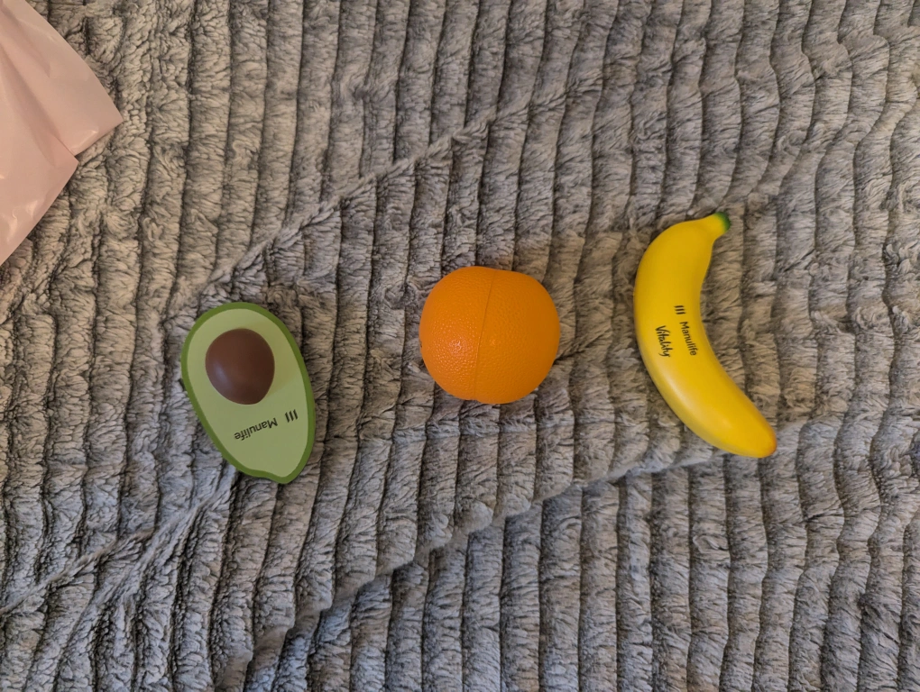 Selling a set of Manulife Vitality stress toys shaped like an avocado, orange, and banana. These are great for squeezing when you're feeling stressed or just need something to fidget with!