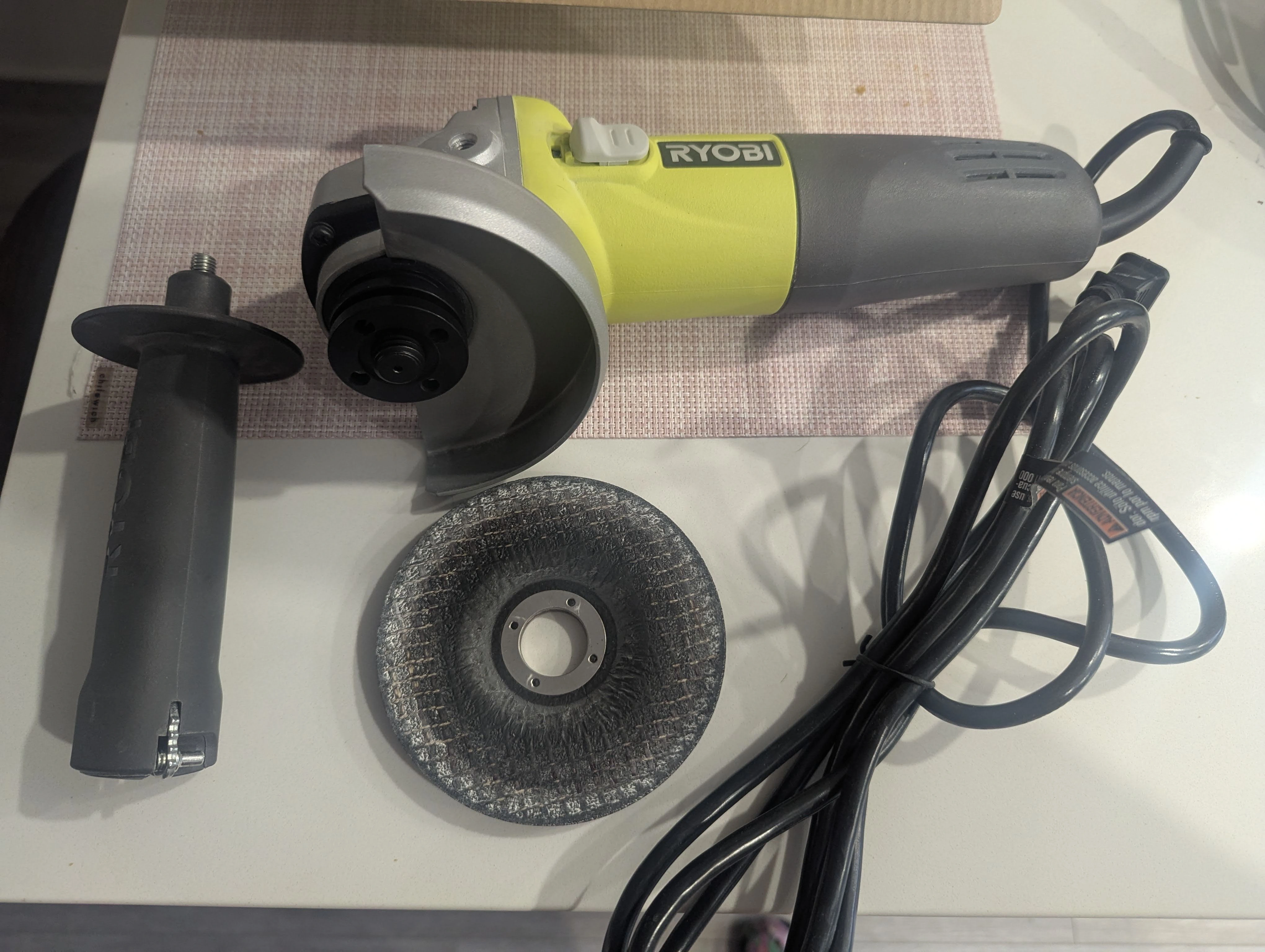 A corded Ryobi angle grinder (with original box and accessories)