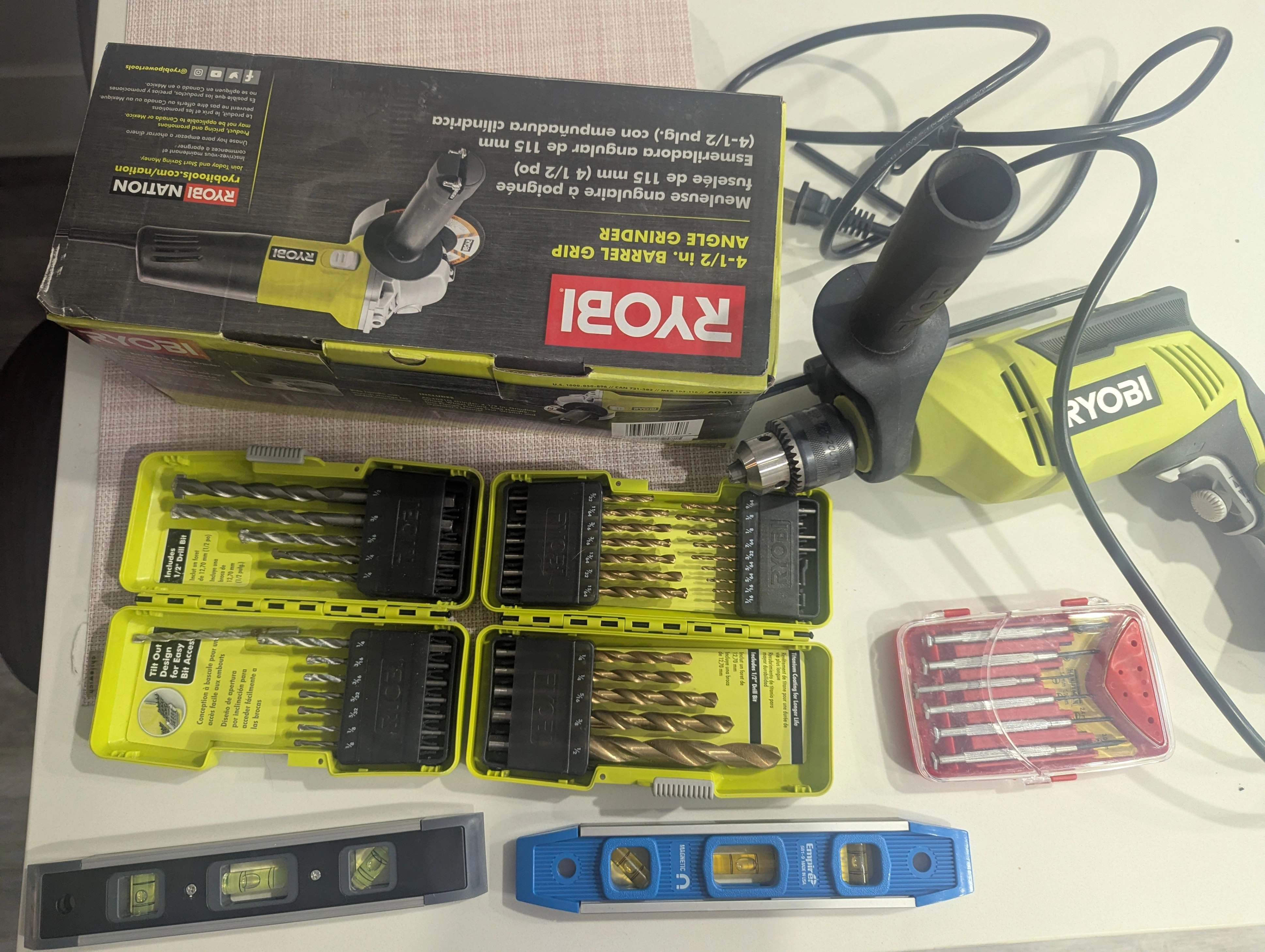Ryobi DIY Tool Bundle - Drill, Grinder, Levels, & Bits