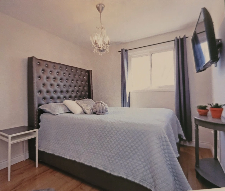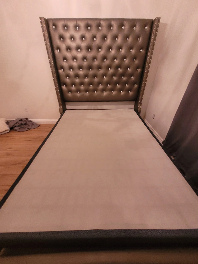 Selling a stylish bed frame with a tufted headboard! The headboard features a button-tufted design, adding a touch of elegance to any bedroom. The frame is sturdy and provides excellent support for your mattress. Perfect for upgrading your sleep space! girls princess bed. I need it gone that's why cheap price. its apart already for pickup. no mattress as I threw that put but has good condition bowstring. asking 150 for all. it's a queen size.brimley and Kingston rd. will need pickup truck for pickup.. negotiable