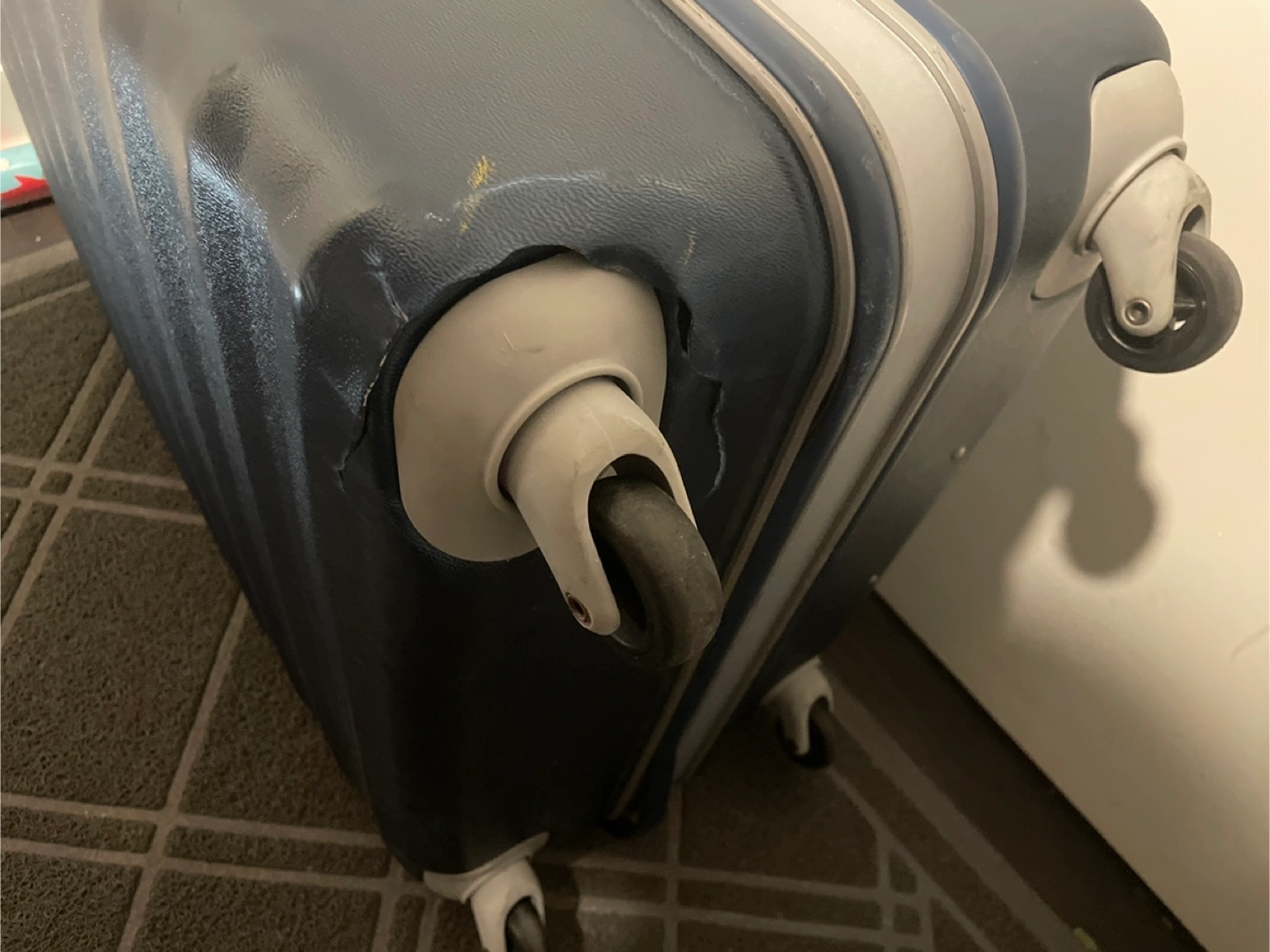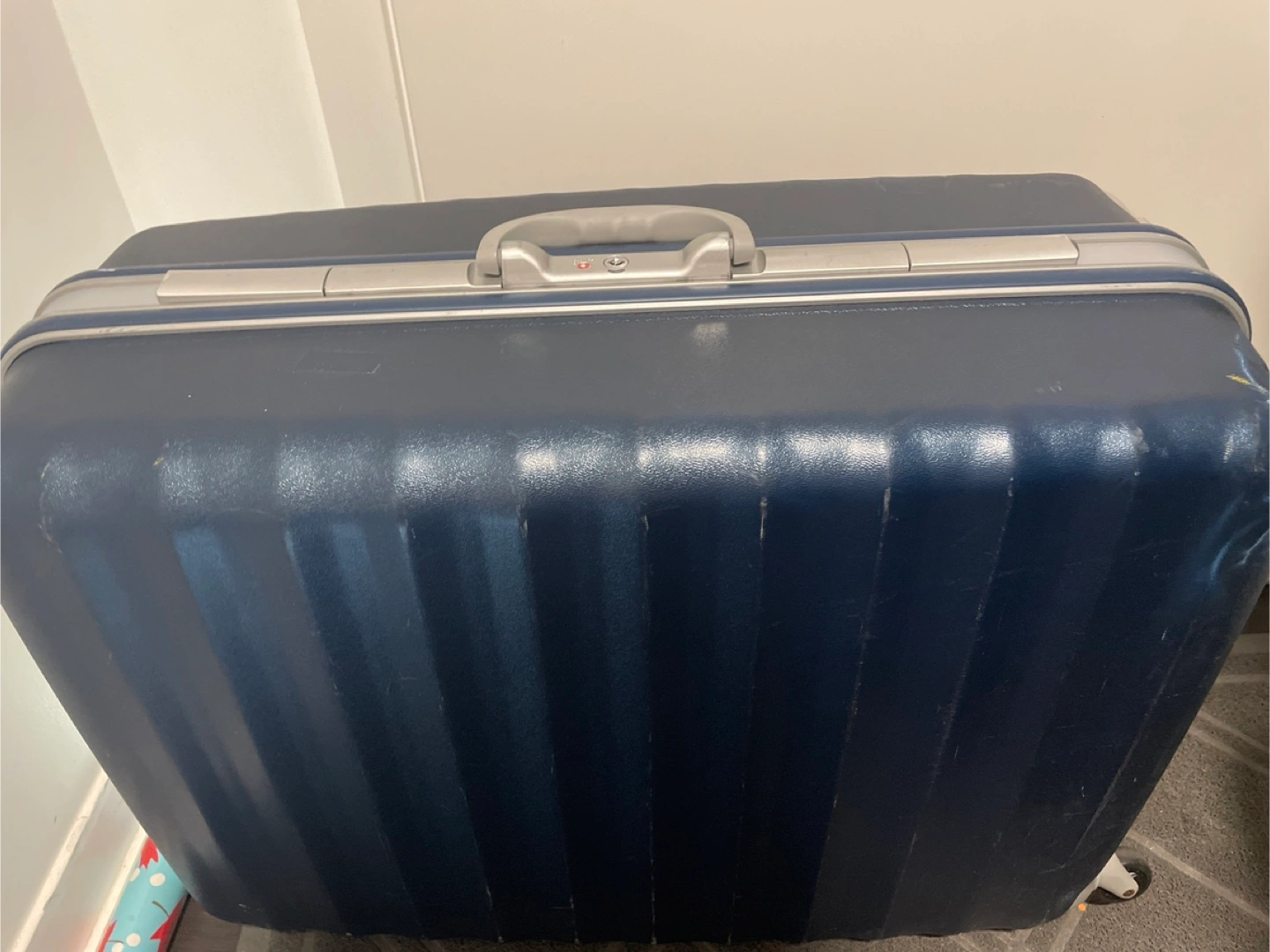 One Wheel slightly damaged. Selling a blue hard shell suitcase. It shows signs of wear and tear, as you can see in the photos, but it's still functional. Great for travel!