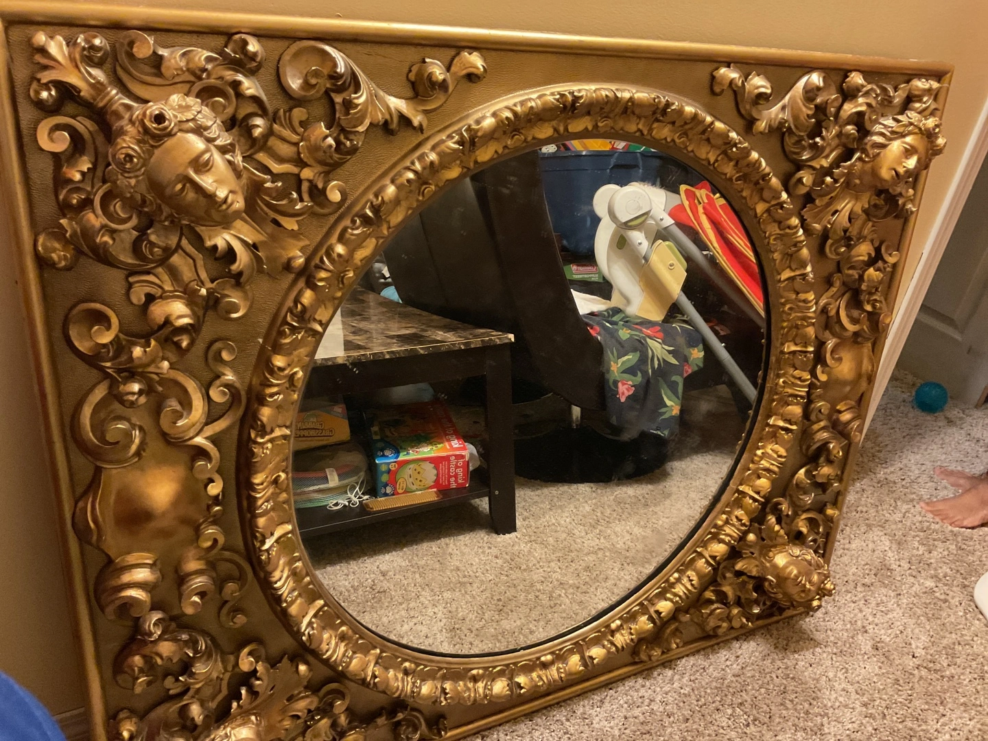 Selling a beautiful ornate mirror with a detailed gold frame. It's a statement piece that would add a touch of elegance to any room. The frame features intricate designs and figures. It's in good condition and ready to find a new home!