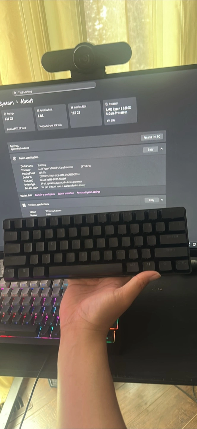 Selling a compact black 60% mechanical keyboard. It's in great shape! The system information shows an AMD Ryzen 5 5600X 6-Core Processor and 16.0 GB of installed RAM. Perfect for a smaller desk setup!