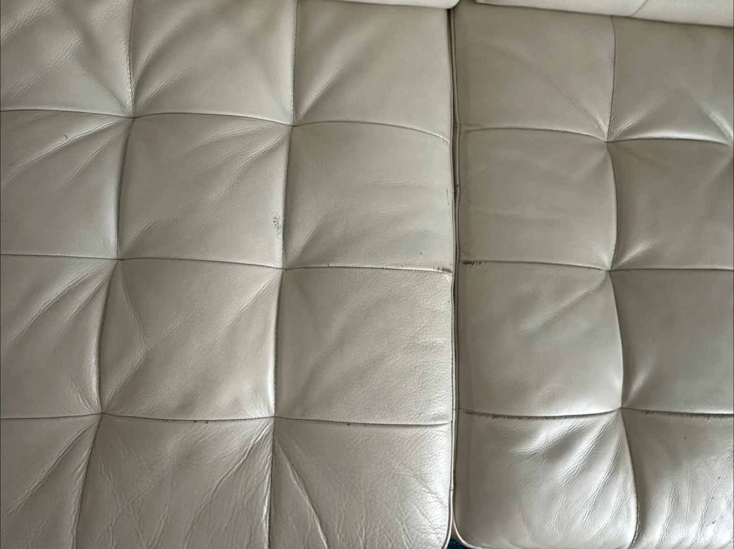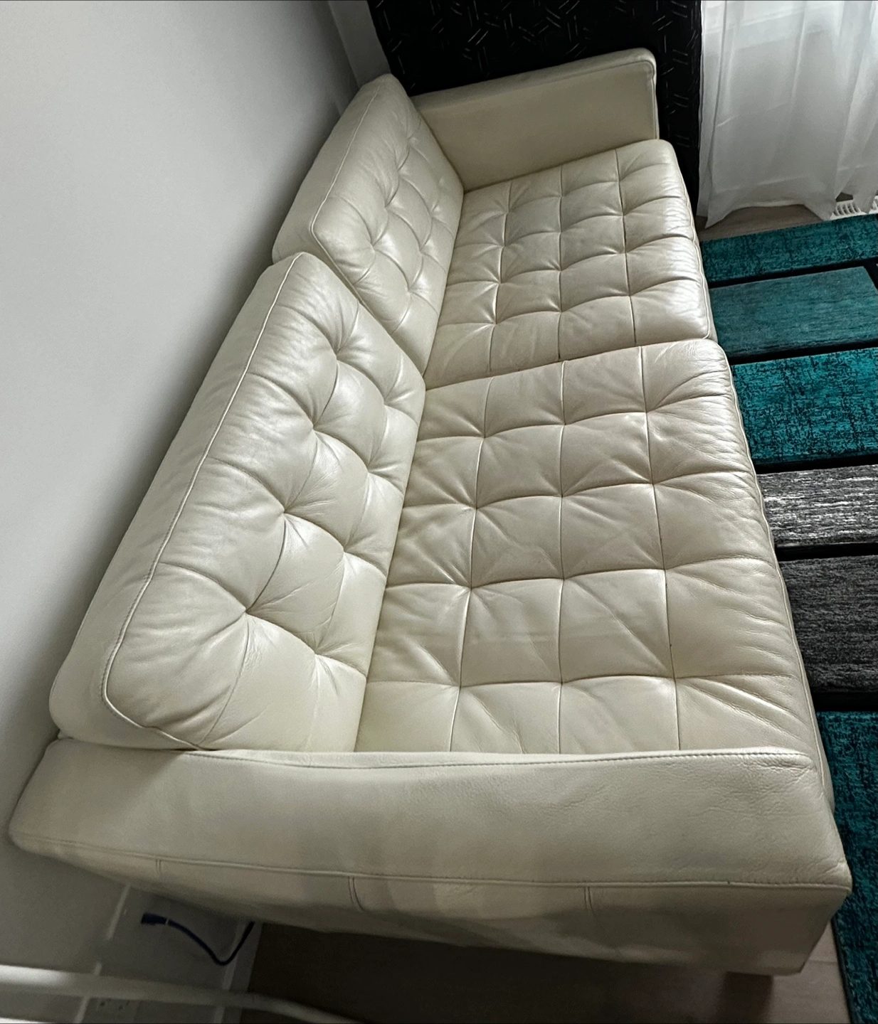 Selling a white leather sofa with a tufted design. It shows some signs of wear, including a few scratches on the seat cushions. Still a stylish and comfortable piece for your living space!