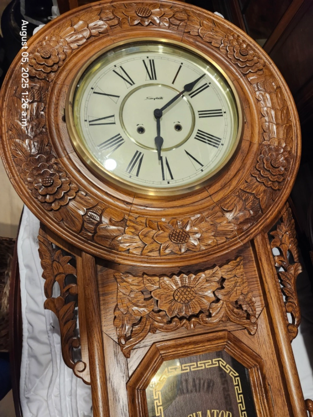 Selling a beautiful antique Regulator wall clock. chimes once on half hour again on hour.It's a stunning piece with intricate carvings and a classic design. Perfect for adding a touch of vintage charm to your home needs