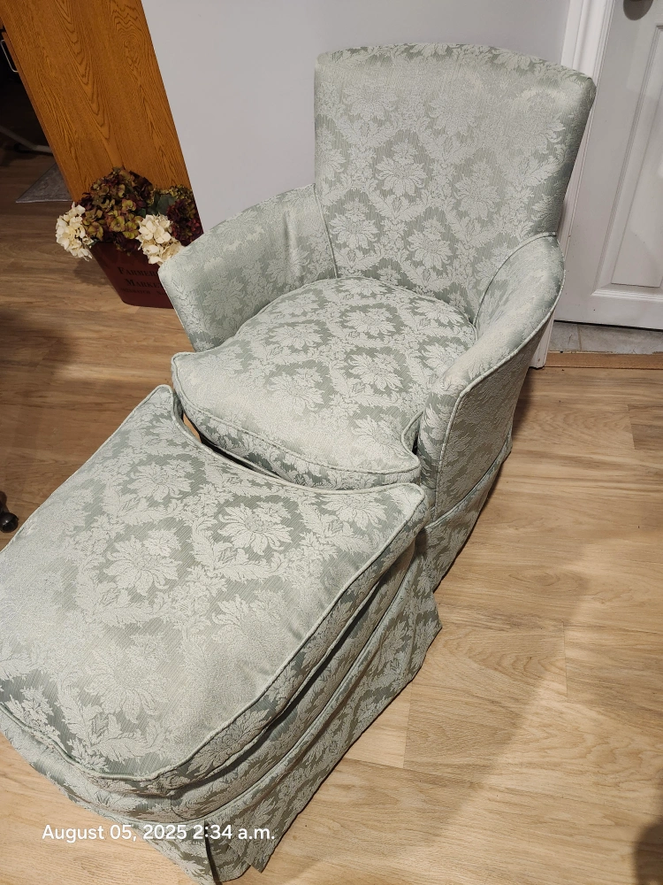perfect for a reading or usung your laptop.The fabric has a subtle pale green on green, flawless material and the chair is super comfy with a supportive back. The ottoman is great for kicking up your feet after a long day. It's in good condition and ready for a new home!