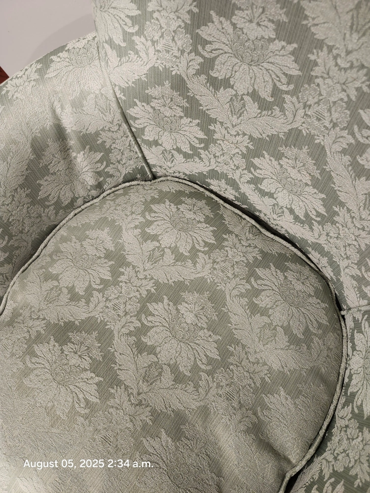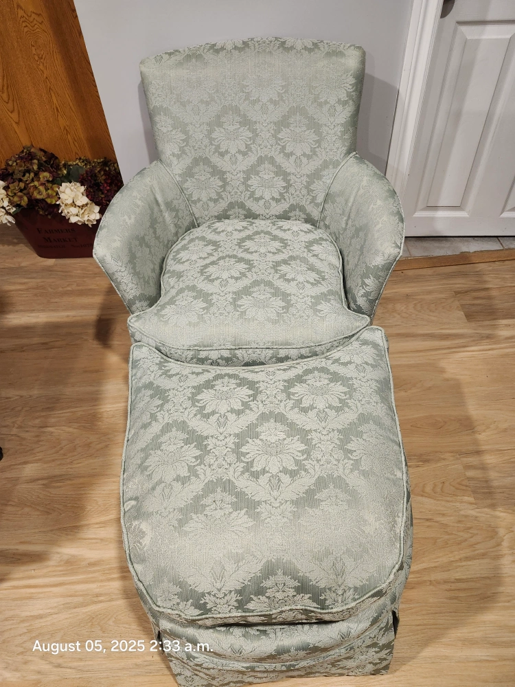 perfect for a reading or usung your laptop.The fabric has a subtle pale green on green, flawless material and the chair is super comfy with a supportive back. The ottoman is great for kicking up your feet after a long day. It's in good condition and ready for a new home!