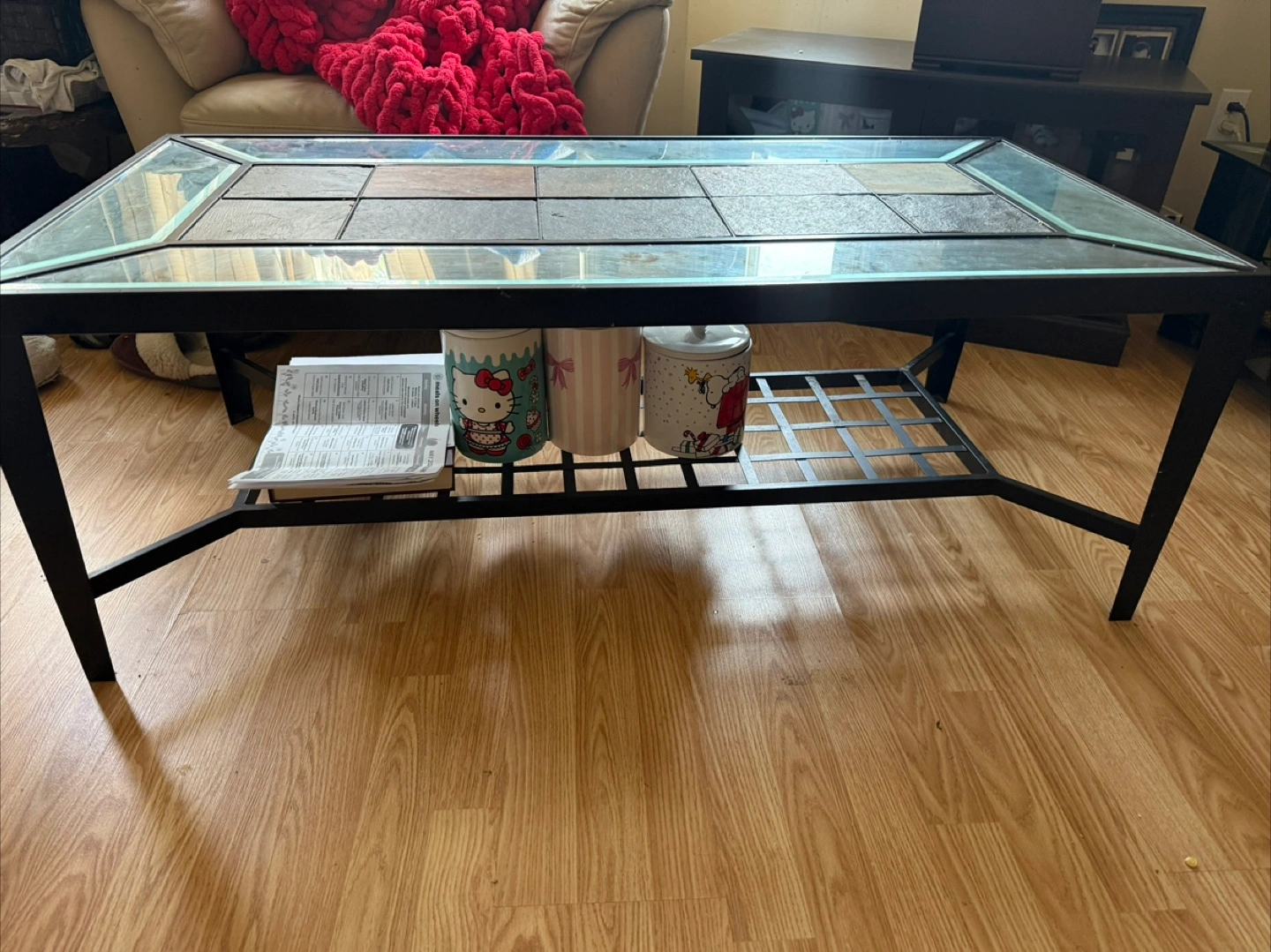 Looking to rehome this coffee table! It features a glass top with a unique slate tile inlay, giving it a stylish and modern look. It's perfect for adding a touch of elegance to your living room. There's also a handy shelf underneath for storing magazines or other items