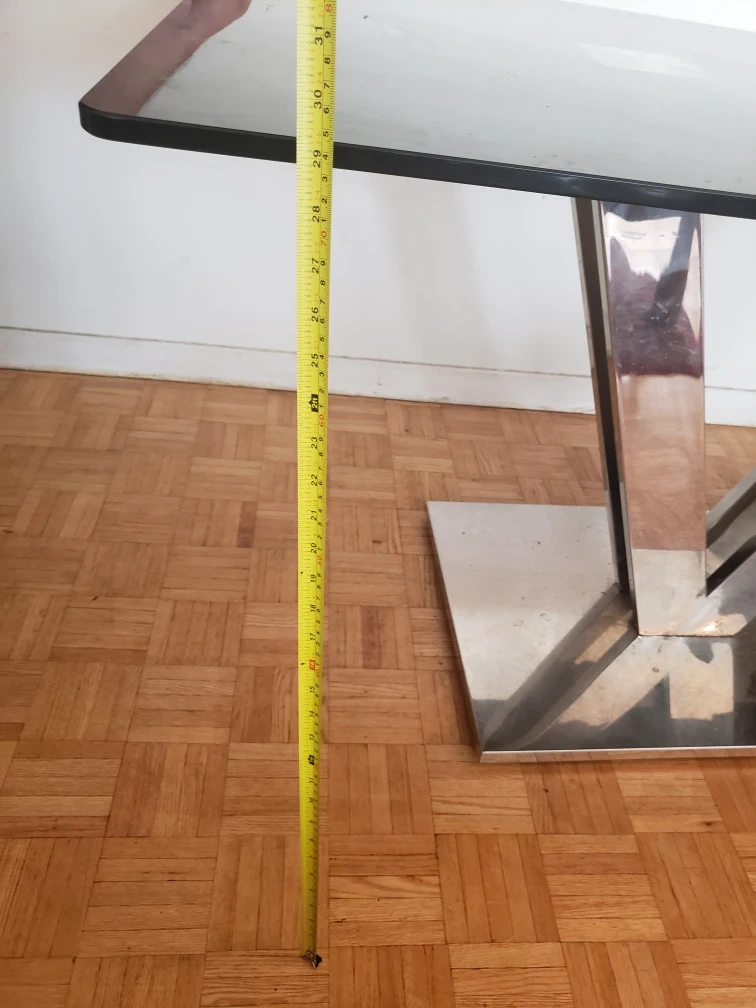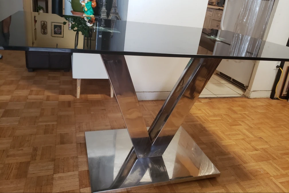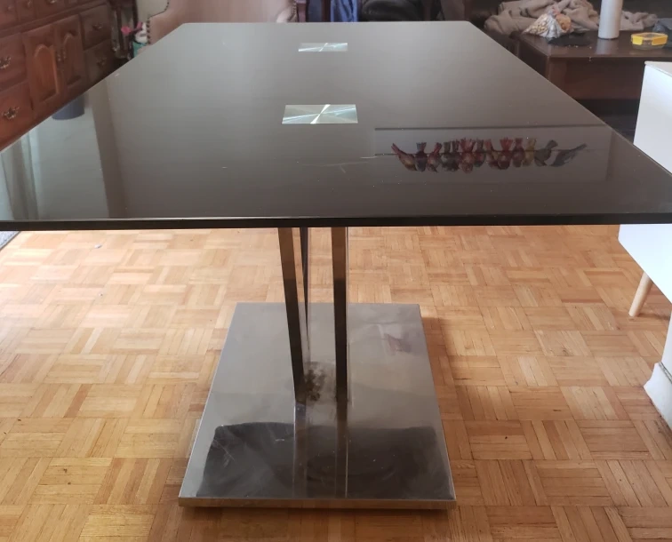 a sleek black glass dining table. very small scratch on it.stainless steel base. It features a modern chrome base and a rectangular top. The table measures approximately 31inches in width and 55 inches in length and height 29 inches. Perfect for a contemporary dining space!