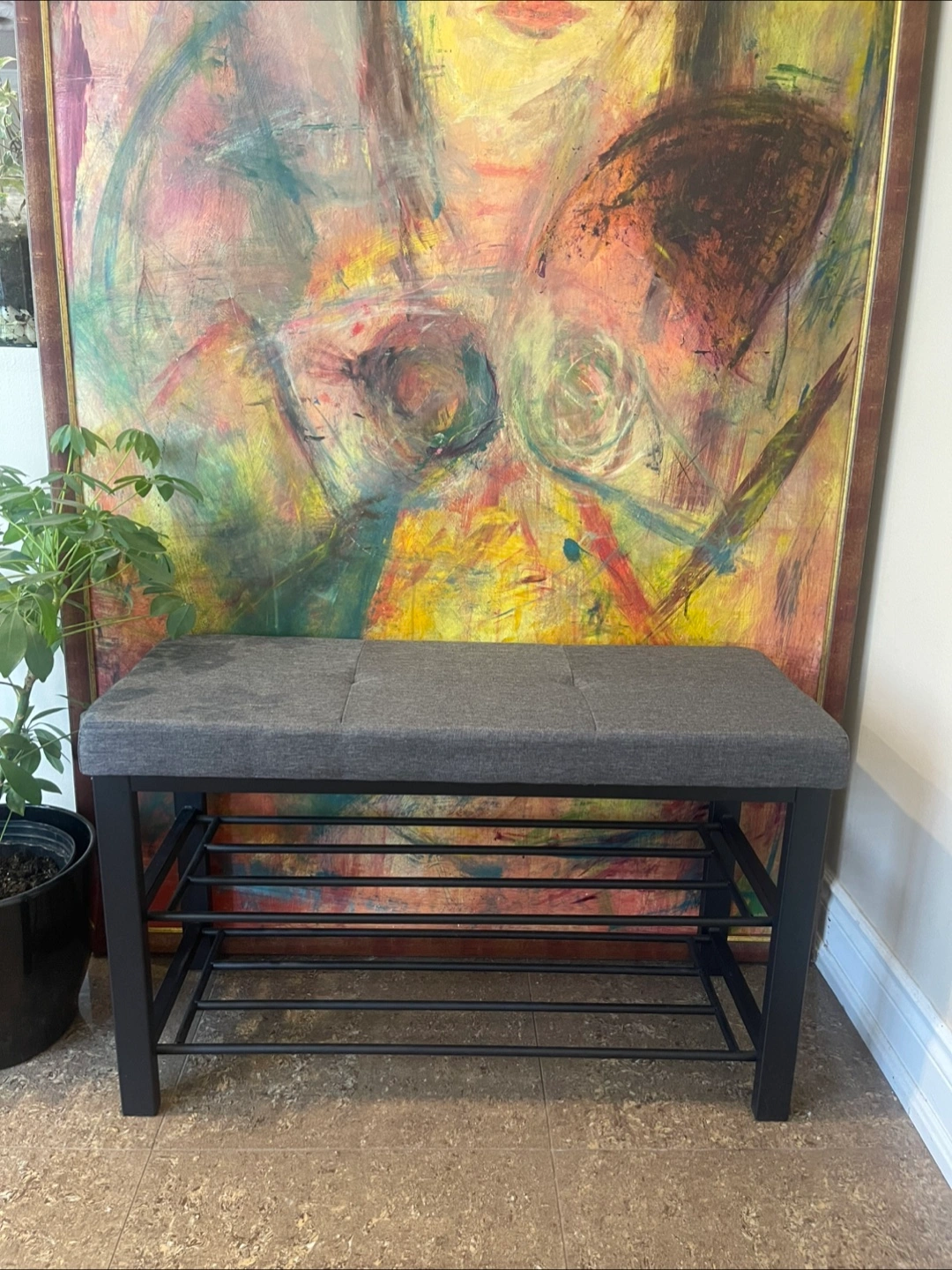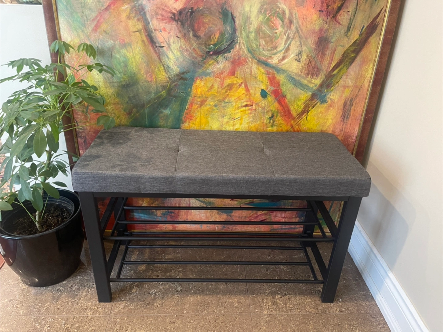 Upholstered Bench with Shoe Rack - Grey and black metal